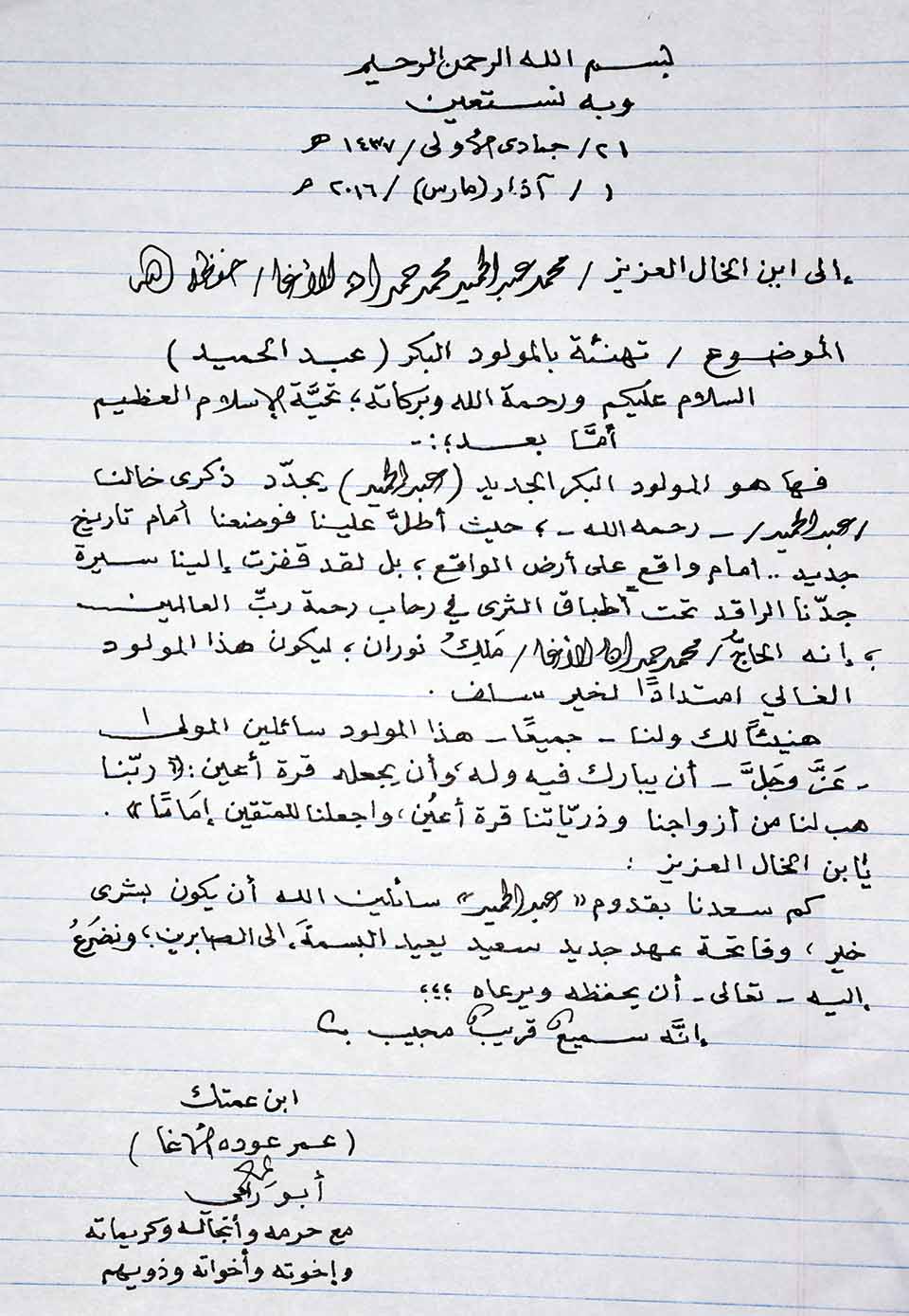 الرئيسة/مولود جديد/تهنئة ومباركة بالمولود البكر عبدالحميد مولود جديد تهنئة ومباركة بالمولود البكر عبدالحميد تاريخ النشر : الأربعاء | 02-03-2016 | 05:08 6044 تهنئة ومباركة من إبن العمة أ. عمر عودة الأغا اضغط هنا للتواصل أو التعرف على أ. محمد عبدالحميد محمد حمدان الأغا يمكنك تلقي أحدث الأخبار أول بأول بانضمامك لإحدى مجموعات الواتساب الخاصة بالعائلة من خلال الضغط هنـا اظهر المزيد