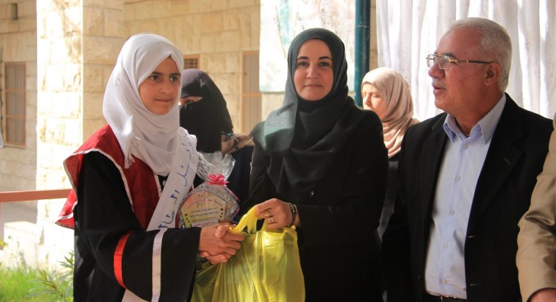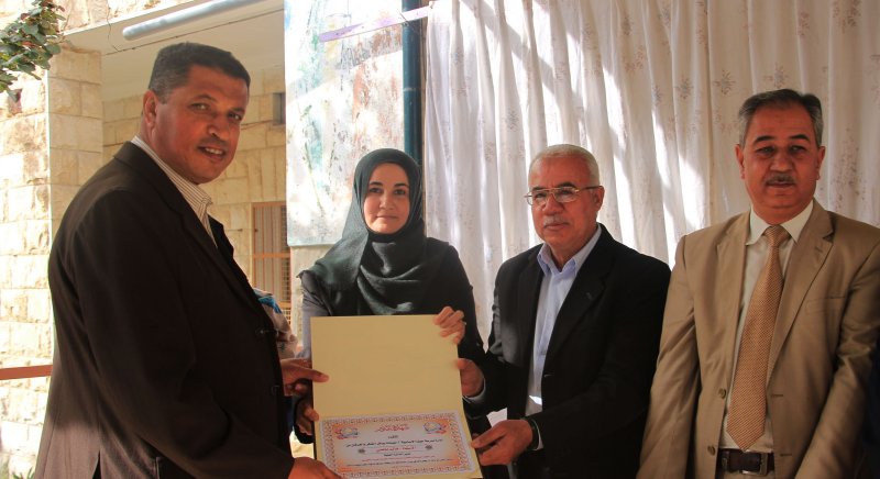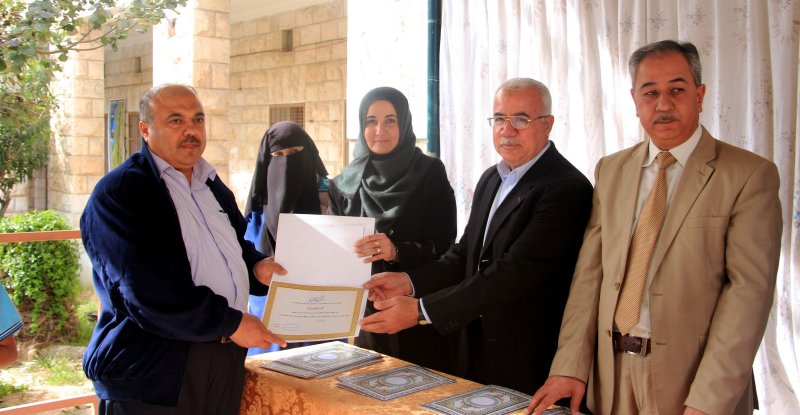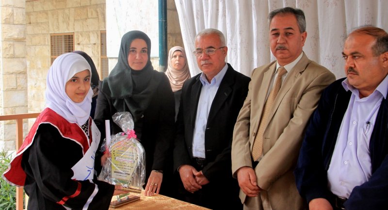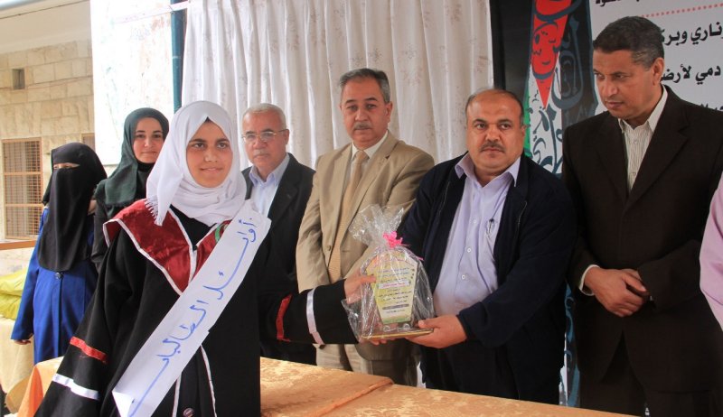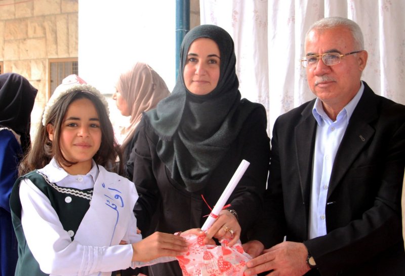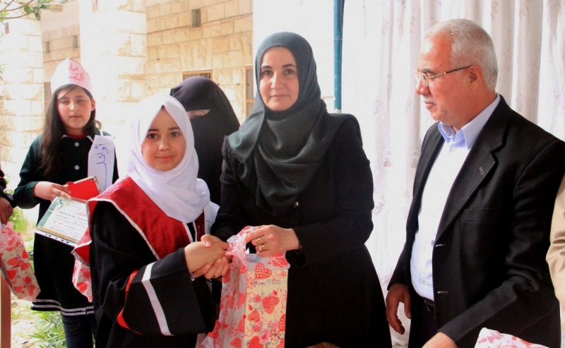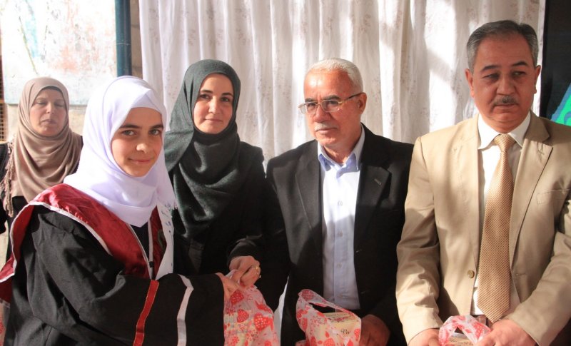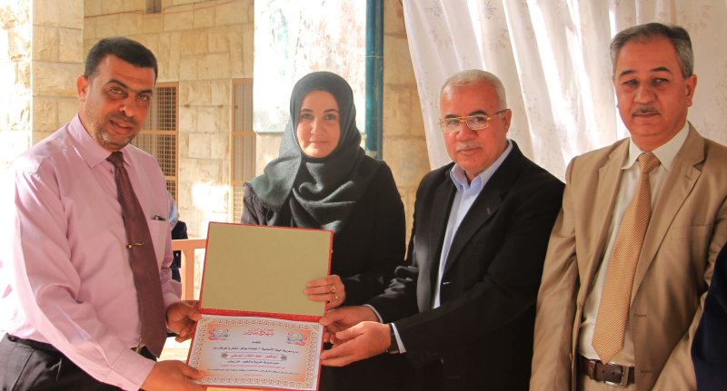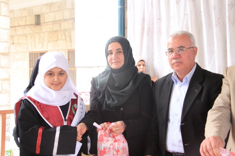 أ.محمد الأغا- مديرة المدرسة أ.ناريمان الأغا ، الطالبة المكرمة هيا مؤنس الأغا
