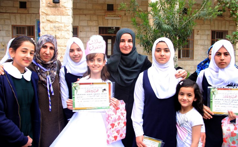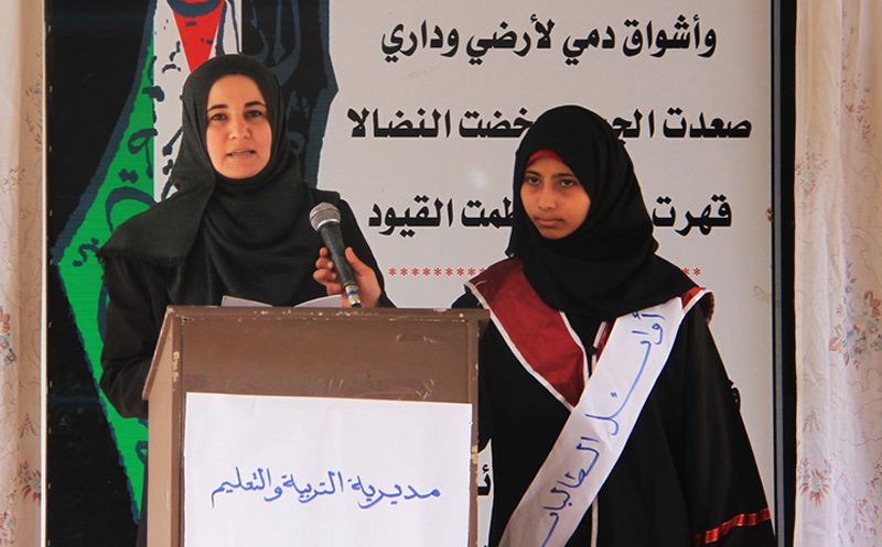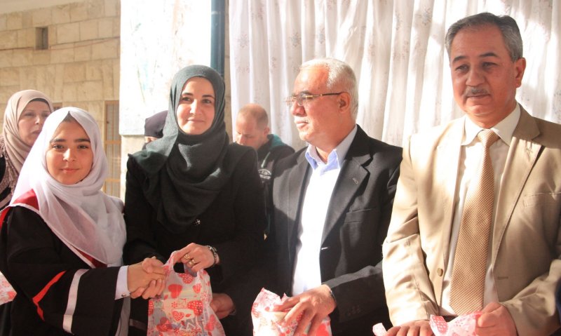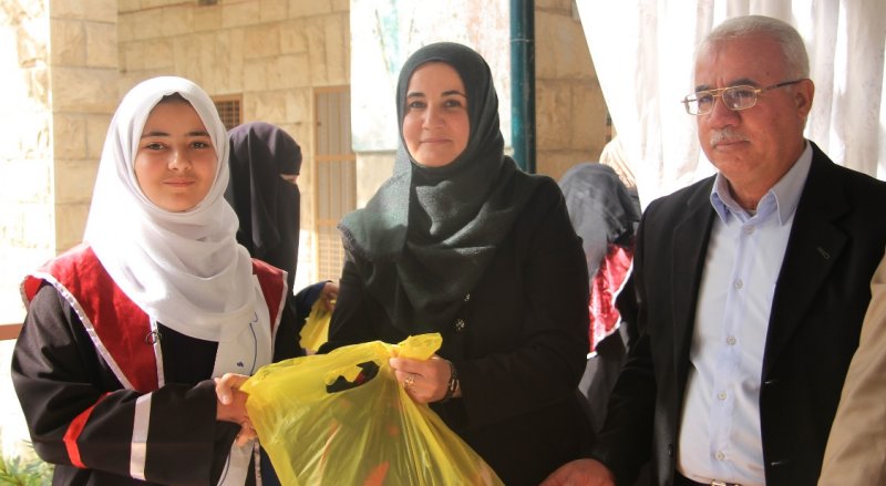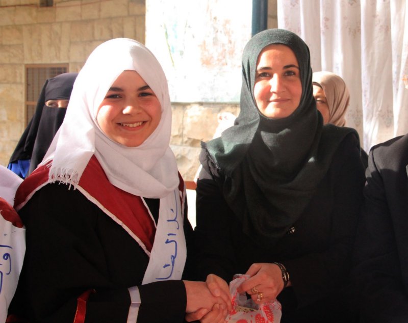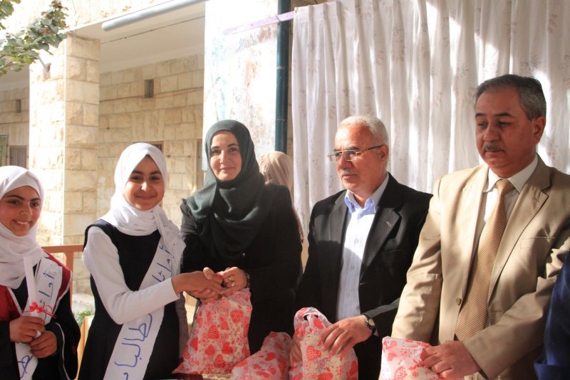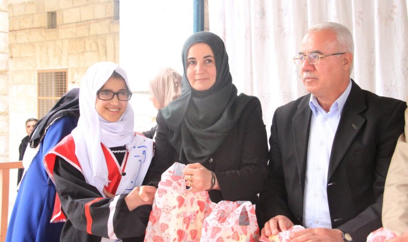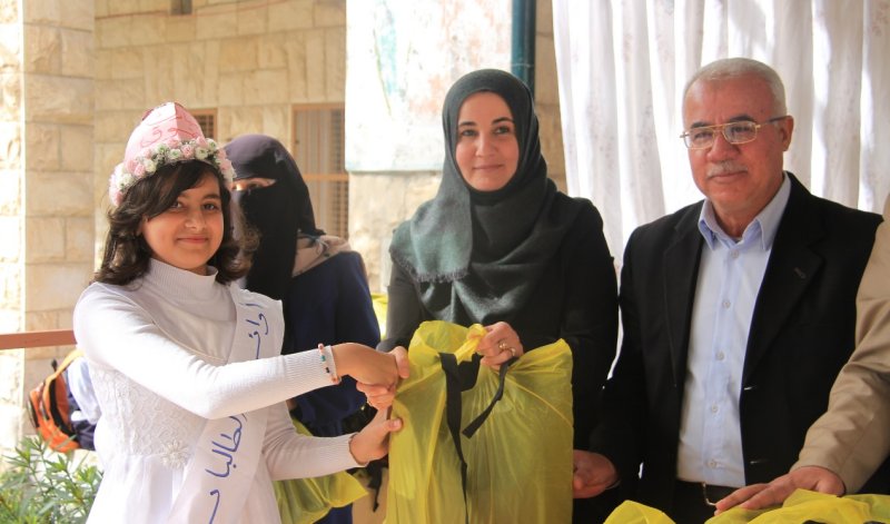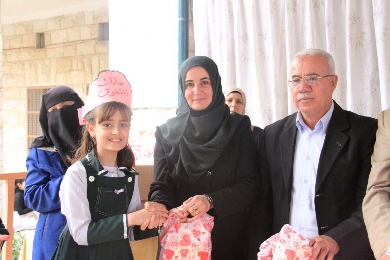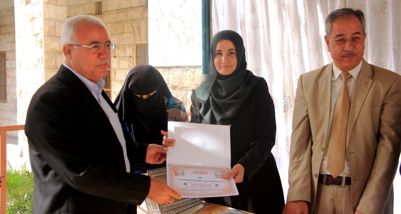 أ.محمد الأغا- مديرة المدرسة أ.ناريمان الأغا ، الطالبة المكرمة هيا مؤنس الأغا