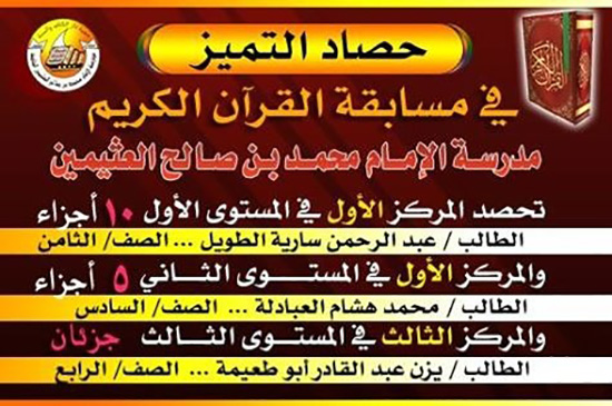 خان يونس- أعلنت مديرية تربية وتعليم شرق خان يونس، عن فوز مدرسة الإمام محمد بن صالح العثيمين، التابعة لجمعية دار الكتاب والسنة، بالمركز الأول بالمرحلتين الثانية والثالثة في مسابقة حفظ القرآن الكريم التي نظمتها المديرية على مستوى مدارس المديرية.