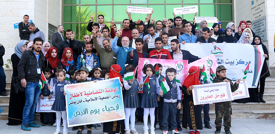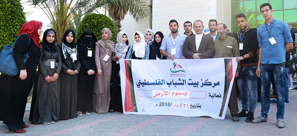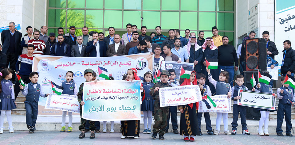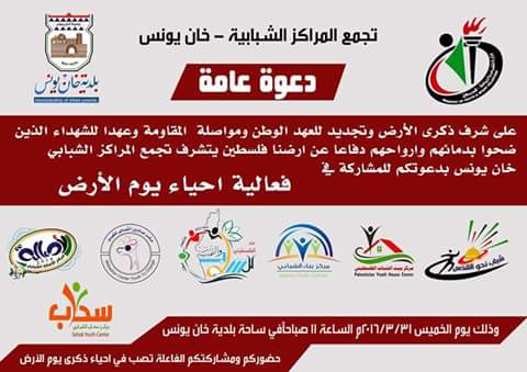 خان يونس- ساحة البلدية- الخميس 31-03-2016- تجمع المراكز الشبابية بخان يونس يقوم بتنفيذ فعالية إحياء يوم الأرض، على شرف ذكرى الأرض، وتجديد العهد للوطن، ومواصلة المقاومة، وعهداً للشهداء الذين ضحوا بدمائهم، وأرواحهم، دفاعاً عن أرضنا فلسطين.