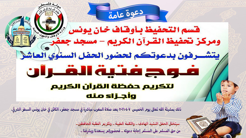 لأنهم الأرواح التي سمت والعقول التي رقت .. ولأنهم القلوب التي بحب الخير تدفقت .. إنهم حفظة كتاب الله .. إنهم السفرة الكرام البررة قسم التحفيظ بأوقاف خان يونس ومركز تحفيظ القرآن الكريم - مسجد جعفر يتشرفون بدعوتكم لحضور الحفل السنوي العاشر (فوج فتية القرآن لتكريم حفظة القرآن الكريم وأجزاء منه).