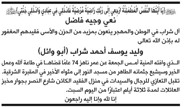 عائلة الأغا في الوطن والشتات تشاطر آل شراب الكرام الاحزان بوفاة فقيدهم المغفور له بإذن الله