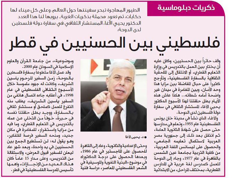 الطيور المهاجرة تبحر سفينة حول العالم وعلى كل ميناء لها حكايات، ثم تعود محملة بذكريات الغربة، يرويها الدكتور الدكتور يحيى الأغا(المستشار الثقافي في سفارة دولة فلسطين).