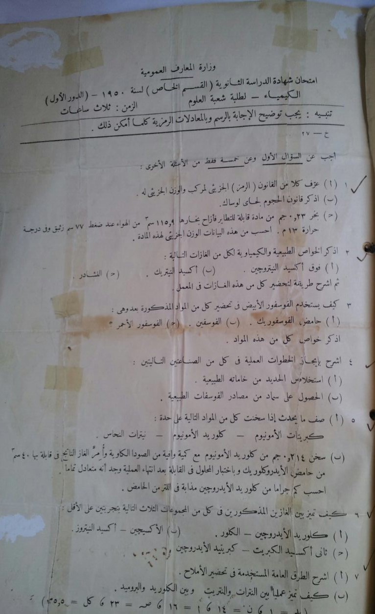 (10) امتحان شهادة الثانوية الكيمياء لسنة 1950