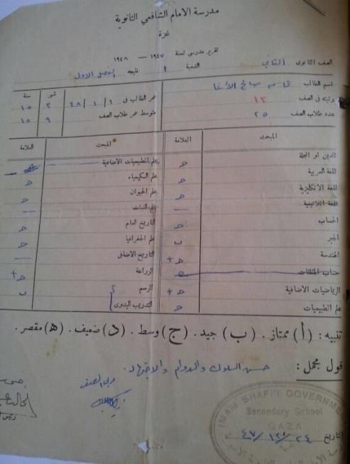 - تم الإلتحاق بمدرسة الإمام الشافعي الثانوية بغزة وهي الوحيدة آنذاك في حينه من رفح جنوباً حتى غزة شمالاً. كان المبنى عبارة عن عنابر للجيش البريطاني، تم تحويلها إلى فصول يدرس بكل منها حوالي 30 طالباً، وكان مدير المدرسة حينها أ.ممدوح الخالدي (غزة) ويُدَرس اللغة الإنجليزية للسنة الثانية الثانوية، ومن المدرسين بالمدرسة أكرم برزق(غزة)، فريح أبومحفوظ(بئر السبع) لغة إنجليزية، توفيق أبو سمرة(غزة) وحنفي فرحات(الجورة) رياضيات، جرار القدوة(خان يونس)، رامز فاخرة، حسن النخالة(غزة) لغة عربية، إبراهيم سكيك(غزة) تاريخ-جغرافيا، الشيخ محمود سرداح (جباليا) دين.(أنظر الصورة 8).