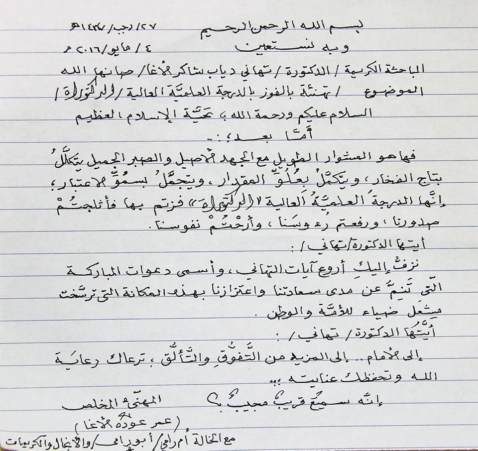 تهنئة مقدمة من أ. عمر عودة الأغا للدكتورة تهاني دياب شاكر الاغا بمناسبة حصولها على الدكتوراة في فلسفة التربية تخصص اللغة العربية في موضوع تطوير منهج التربية الاسلامية للمرحلة الثانوية في ضوء معاير الجودة في الجامعات المصرية وذلك بتاريخ 30-04-2016 وبدرجة ممتاز، والف مبارك.