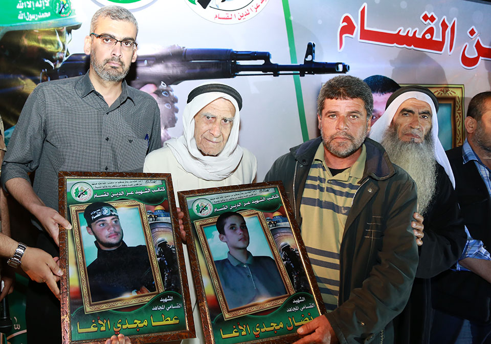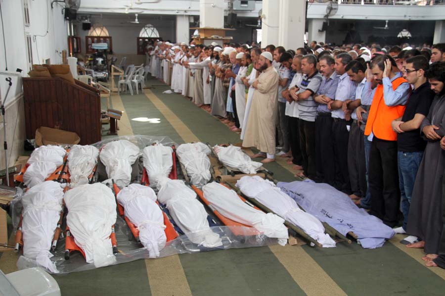 صورة من الإرشيف (إرتقاء 14 شهيداً من عائلة الأغا بتاريخ 2014-07-29، الذين إرتقوا في إستهداف 3 منازل متجاورة، وإستهداف أخر من قبل طائرات العدو في منطقة قاع القرين لدراجة نارية ادى لاستشهاد السيد أحمد حسن مصطفى حسين الأغا، ونجله مصطفى، بالقرب من الجامعة الإسلامة جنوب مدينة خان يونس).