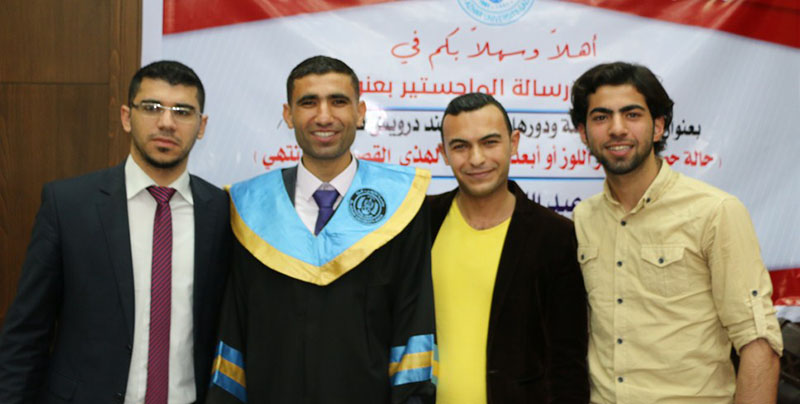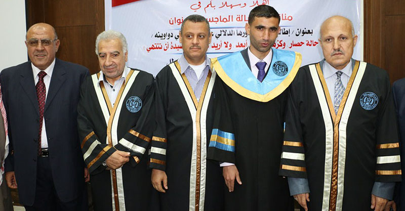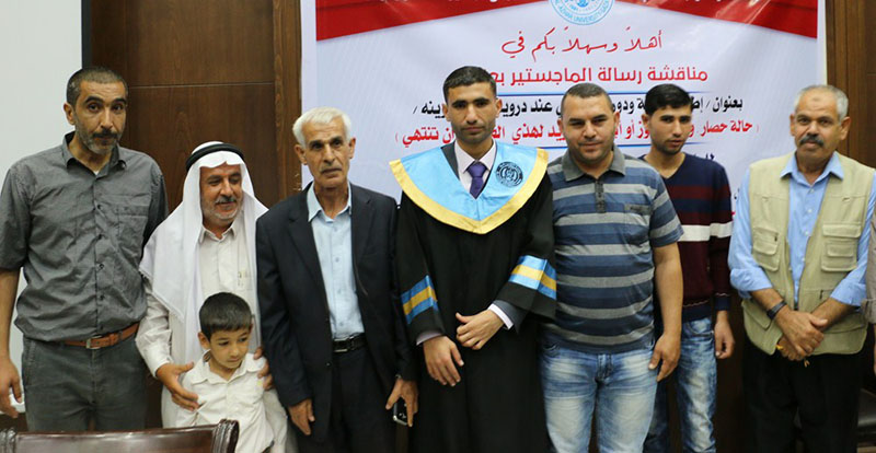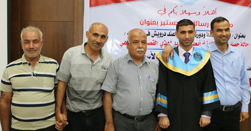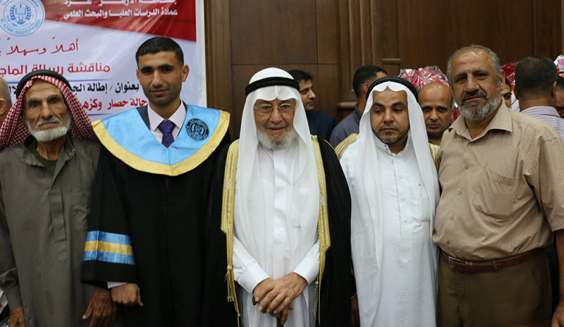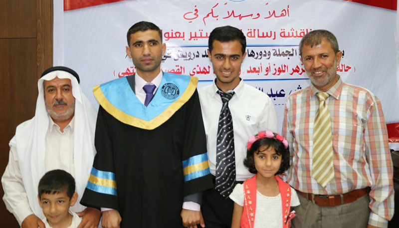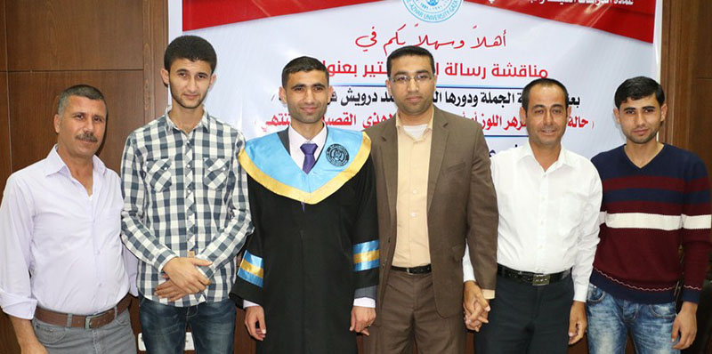 غزة- الخميس 02-60-2016- جامعة الأزهر- حصول الباحث عبد الله جمال زارع الأسطل على الماجستيرفي اللغة العربية، وألف مبارك وكانت رسالة الماجستير بعنوان : اطالة الجملة ودورها الدلالي عند درويش في دواوينه وقد أشرف على الرسالة د.فضل النمس، وناقشها كل من أ.د.صادق أبو سليمان مناقشاً خارجياً والدكتور عبد الله عبد الجليل علي مناقشاً خارجيا