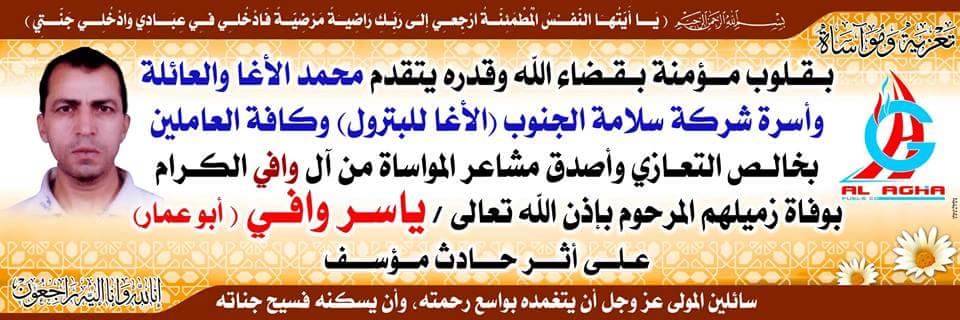 تتقدم عائلة الأغا في الوطن والخارج بالتعازي والمواساة من آل وافى الكرام بوفاة فقيدهم
