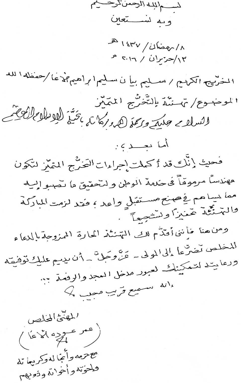 تهنئة مقدمة من أ. عمر عودة الأغا