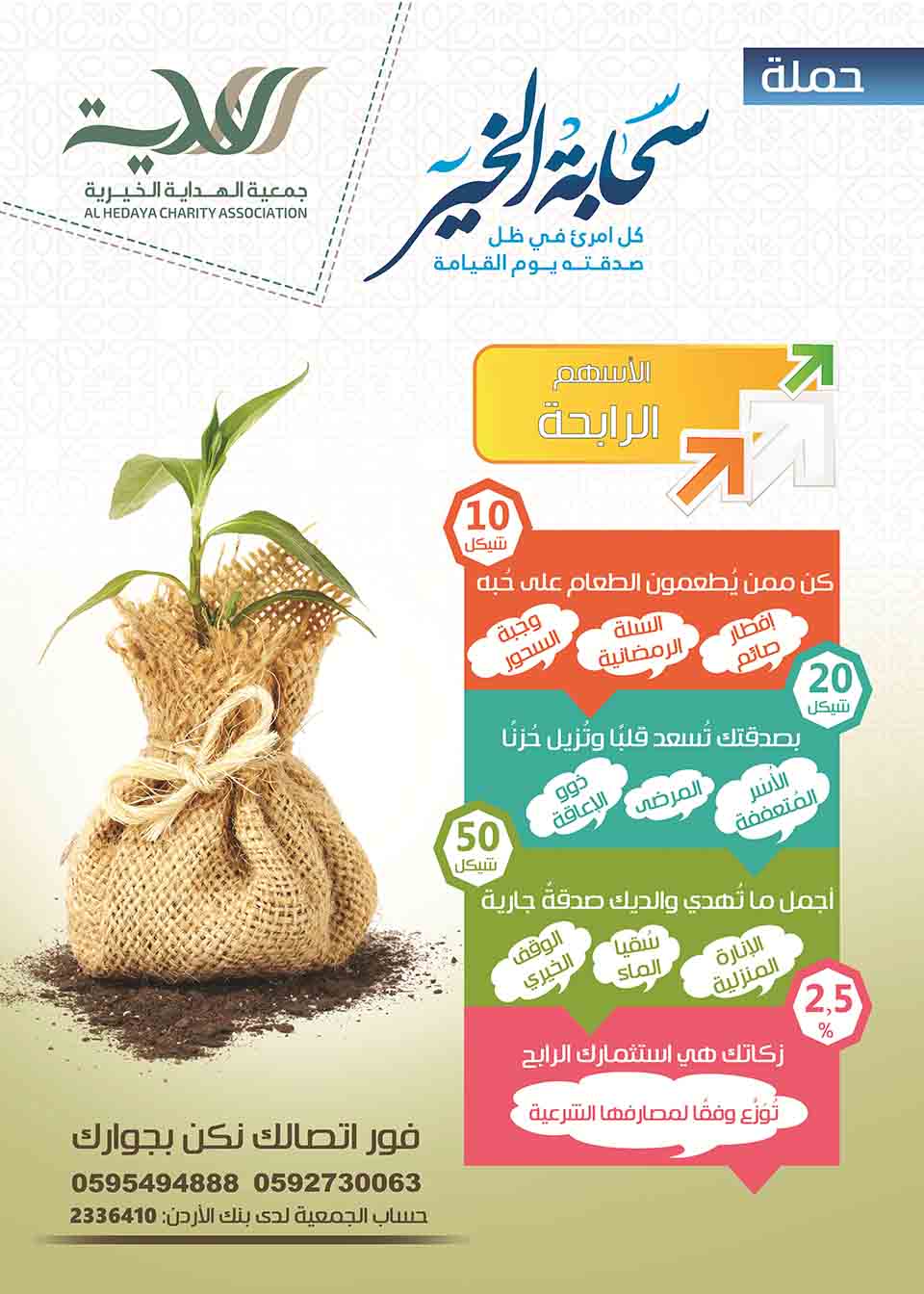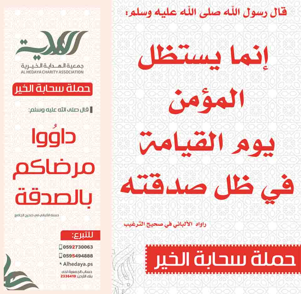 الإثنين 2016-06-06م، الموافق: 01 رمضان1473هـ، دير البلح- قطاع غزة- تحت شعار مُنحازون للمُتعفف أطلقت جمعية الهداية الخيرية حملة: (سحابة الخير 2) للعام الثاني على التوالي 1437هـ- 2016م، بهدف حث المُقتدرين من شرائح المجتمع الفلسطيني إلى التبرع بزكواتهم وصدقات أموالهم؛ مساهمةً في تحقيق مبدأ التكافل بين الشرائح المعوزة والمُتعففة بقطاع غزةتحت شعار: #مُنحازون_للمُتعفف.