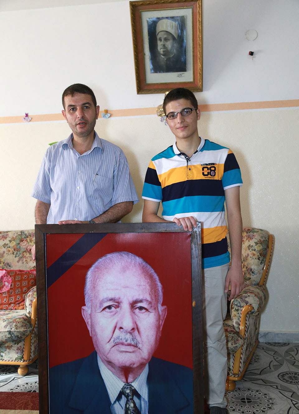 المتفوق حازم ووالده أ. إيهاب، وأمامه صورة جده رحمه الله وخلفه صورة جد والده