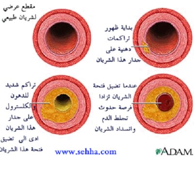 تتزاحم الأسئلة لديك لمعرفة ماهية هذا المرض الصامت القاتل الذي يهاجمك فجأة دون مقدمات , ولا تدري أنك وزوجتك وأهل بيتك المسئولين عن إعداد وجباتك الغذائية هم من يقع علي عاتقهم ولحد كبير إصابتك بهذا المرض . أبدأ بسؤال بسيط للجميع وهو: هل قمتم في يوم من الأيام بتغيير شبكة المياه الداخلية القديمة في بيوتكم ؟ هل رأيتم حال تلك الشبكة " المواسير" التي اعتراها وكساها الصدأ من الداخل بعد سنوات طويلة من الاستخدام؟ ببساطة ستشاهدون أن قطرها أصبح ضيقاَ بدرجة كبيرة نظراً لتراكم الصدأ علي جدرانها وأصبح وصول الماء إلي هدفه النهائي قليل أو معدوم. هكذا الحال في حالة المرض الصامت ( تصلب الشرايين ). فالصدأ أشبه بالكولسترول والدهون مع الفارق في الخطورة . ففي حالة تصلب الشرايين تترسب وتتراكم كميات من الكالسيوم والدهون والكولسترول والألياف علي الجدران الداخلية للشرايين أو علي جزء منها علي مدار سنوات عديدة دون أن تلاحظ أي أعراض مرضية .ويظل المرض صامتاً إلي أن تشعر بألم فجائي في الصدر كأحد الأهداف التي تصاب . عندها تكون الجدر المرنة (المطاطية) للشرايين قد تحولت إلي جدر (صلبة) وأصبح قطرها ضيقاً أو أصيبت بالانسداد الجزئي أو الكلي.فما هو الكولسترول؟ الكولسترول مادة دهنية تتواجد في الدم وفي كل خلايا الجسم، ويحتاجها الجسم لبناء الخلايا وتصنيع بعض الهرمونات. يأتي الكولسترول من مصدرين أساسيين : المصدر الأول يتم تصنيعه في الكبد ، أما المصدر الثاني فهو من تناول اللحوم بأنواعها ، بالإضافة إلى مشتقات الحليب و البيض. ينتقل الكولسترول في الجسم عبر الأوعية الدموية ، و نظراً لعدم انحلاله في الدم ، فإن انتقاله من وإلى خلايا الجسم يتم محمولاً على حوامل خاصة تسمي البروتينات الدسمة . و هناك أنواع عديدة لهذه البروتينات أهمهما : البروتين الدسم منخفض الكثافة ( LDL ) والذي يعرف بالكولسترول الضار.والبروتين الدسم عال الكثافة( HDL (والذي يعرف بالكولسترول النافع أو الجيد. وعندما ترتفع نسبة الكولسترول السيئ في الدم يترسب تدريجياً علي الجدار الداخلي للشرايين . ومع مرور السنين تصبح تلك المواد الدهنية المترسبة والمتراكمة كثيفة وقوية مسببة ضيق بها, الأمر الذي يؤدي إلى ضعف تدفق الدم المحمًل بالأكسجين للعضو الذي يغذيه عبر هذا الشريان فيؤدي في النهاية إلى ضعف حيوية ووظيفة هذا العضو . أما إذا حصل انسداد كامل لهذا الشريان , فأن ذلك يؤدي إلى موت العضو أو جزء من العضو الذي يتغذي من هذا الشريان مثل حدوث موت جزء من عضلة القلب نتيجة لانسداد الشريان التاجي الذي يغذي هذه العضلة. وفي بعض الحالات يودي تراكم الدهون على جدر الشرايين إلى ضعف جدار الشريان وبالتالي تمزقه وحدوث النزيف مثل النزيف الذي يحدث في المخ محدثا السكتة الدماغية عند كبار السن. وفي حالات أخرى يؤدي تراكم الدهون على جدران الشرايين إلى انفصال أجزاء صغيرة من هذه التراكمات وانتقالها عبر الدم محدثة انسداد لشرايين أخرى صغيرة وبالتالي حدوث جلطة في مكان بعيد عن مصدر هذه الجلطة. الشكل المنقول أدناه يفسر ما تقدًمنا بذكره ويبين الشكل الطبيعي للشرايين حيث قطر الشريان الطبيعي "الواسع" ثم بداية تكوين وترسب الدهون علي جدر الشريان , ثم ضيق القطر نتيجة تراكم الدهون (اللون الأصفر), ثم الانسداد الذي حصل فيها نتيجة تراكم الدهون .
