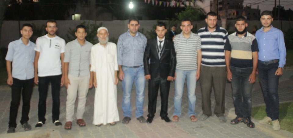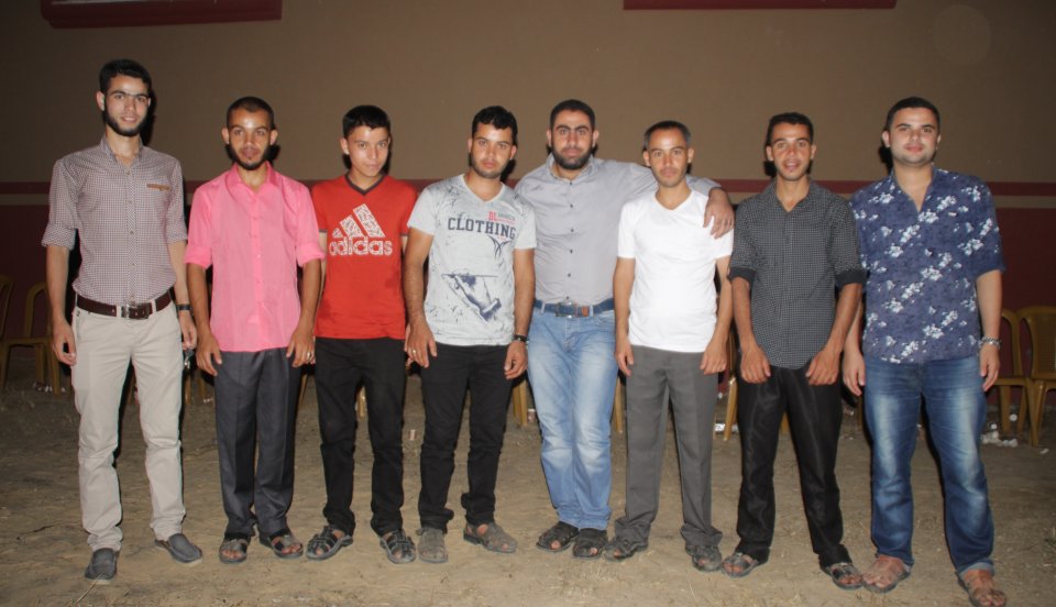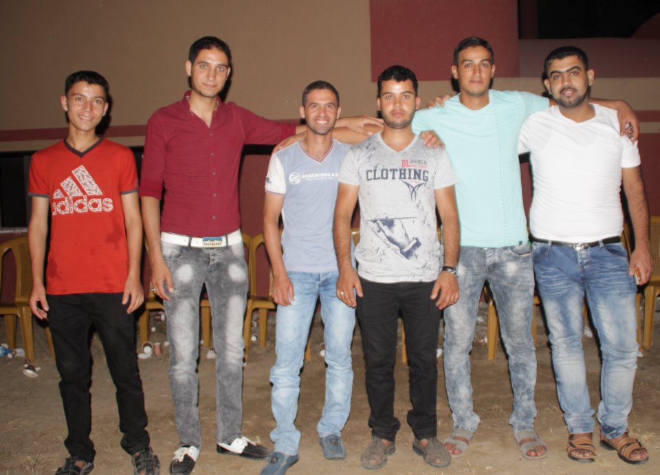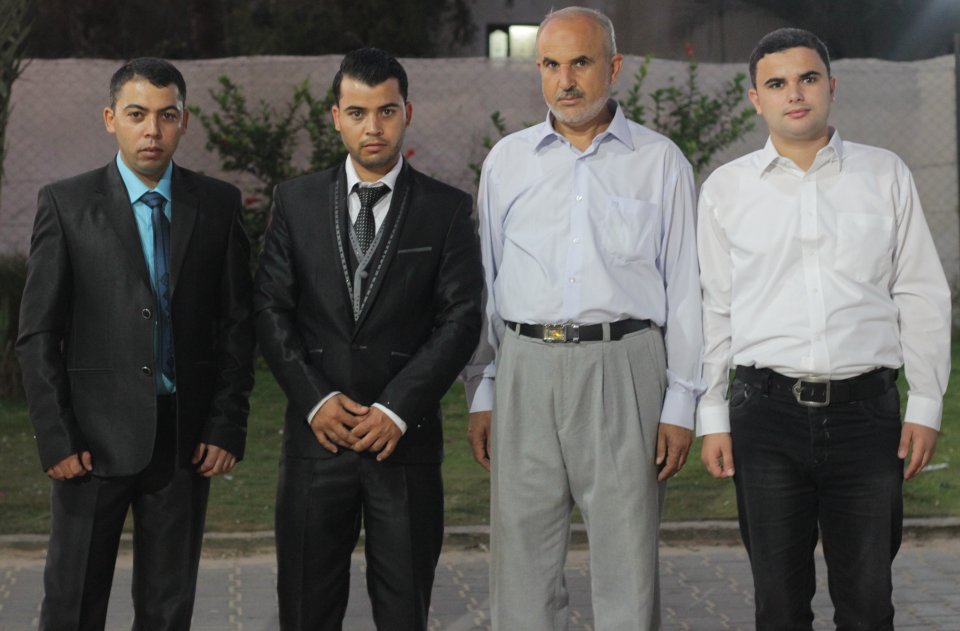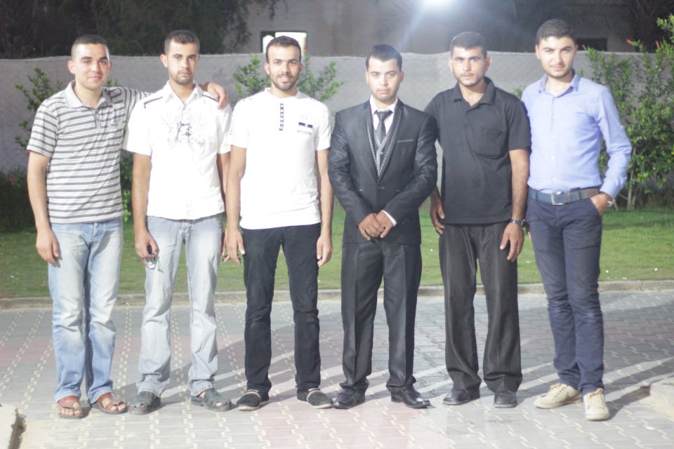 علاء سامي، يحيى ياسين(ابن عم العريس)، صديق العريس، يوسف عمرو(ابن عم العريس)، العريس، أسعد الأسطل(زوج شقيقة العريس)، والد العريس،