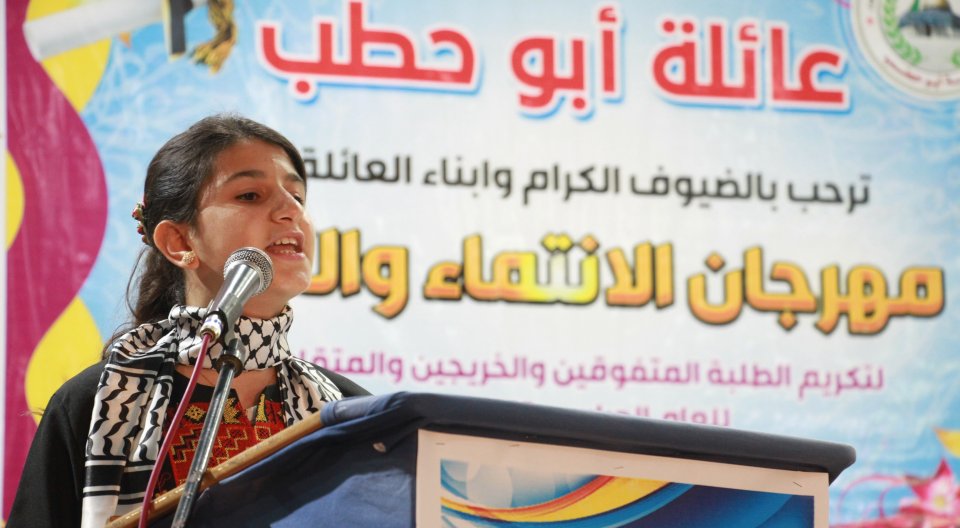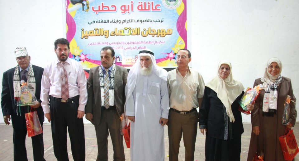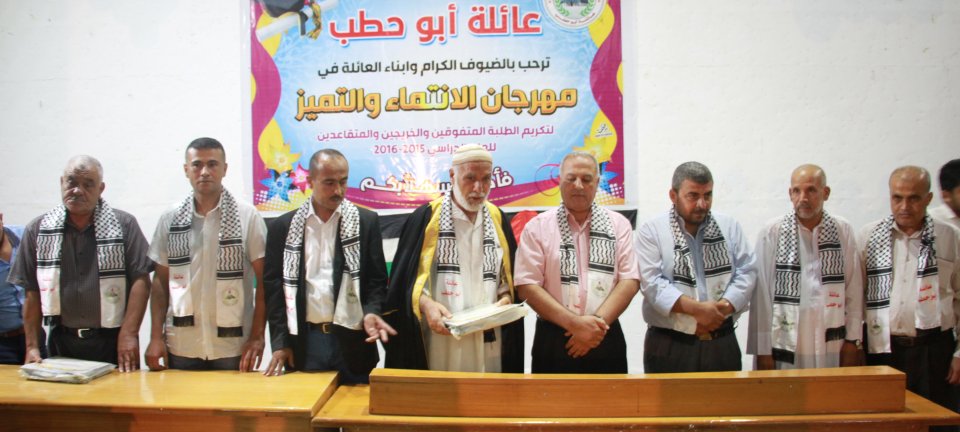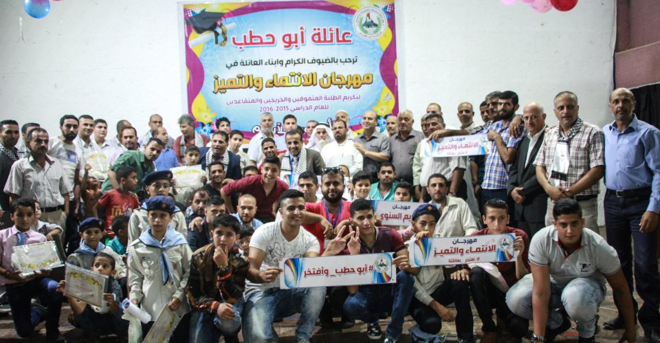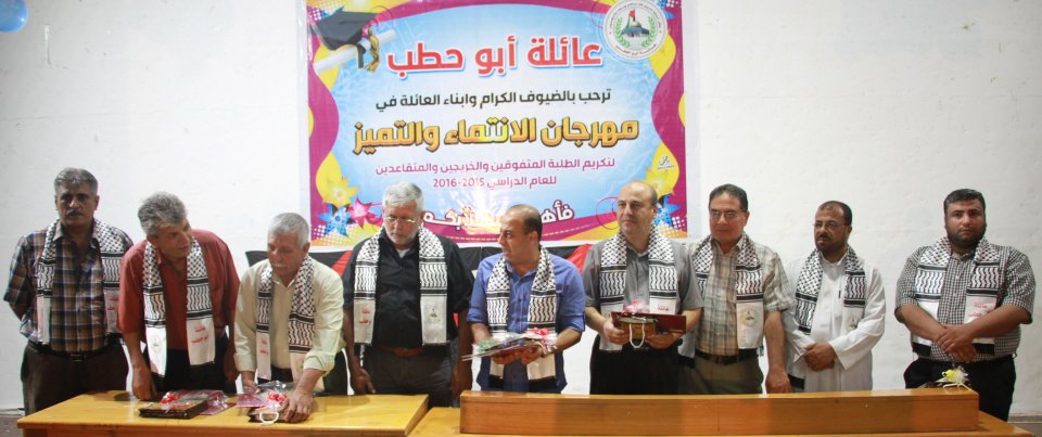 وسط حضور رسمي وعائلي وبمشاركة الشخصيات الاعتبارية والوطنية ولفيف من شخصيات المجتمع المحلي، نظمت عائلة أبو حطب في مدينة خانيونس حفلها السنوي لتكريم أبنائها الطلبة المتفوقين والخريجين والحاصلين على الدرجات العلمية والمتقاعدين للعام الدراسي 2015-2016، والذي حمل اسم "الانتماء والتميز" وذلك في قاعة الهلال الأحمر الفلسطيني.