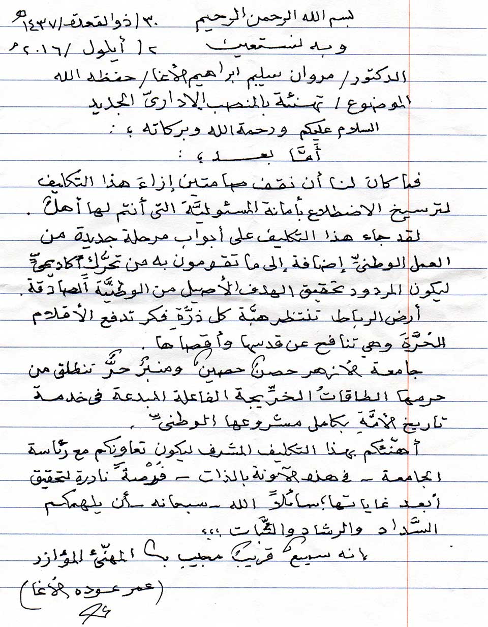 تهنئة مقدمة من أ. عمر عودة الأغا