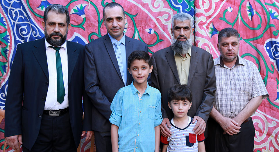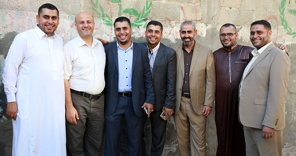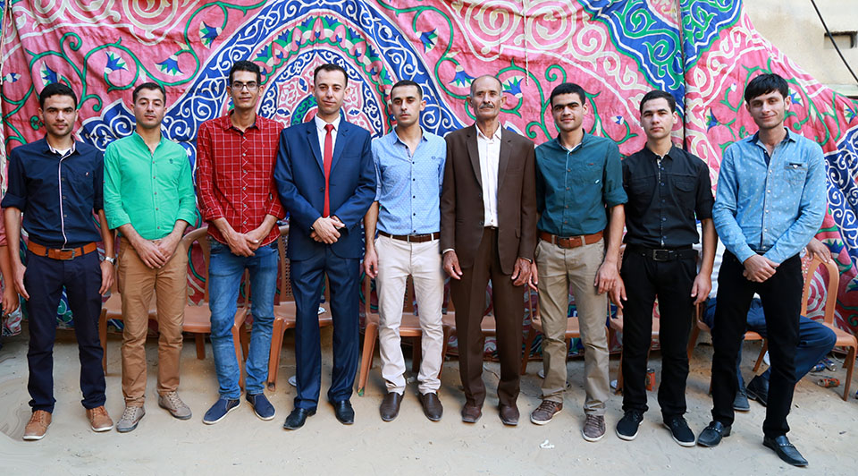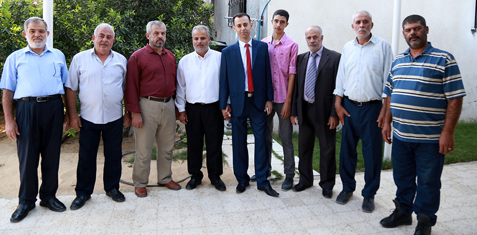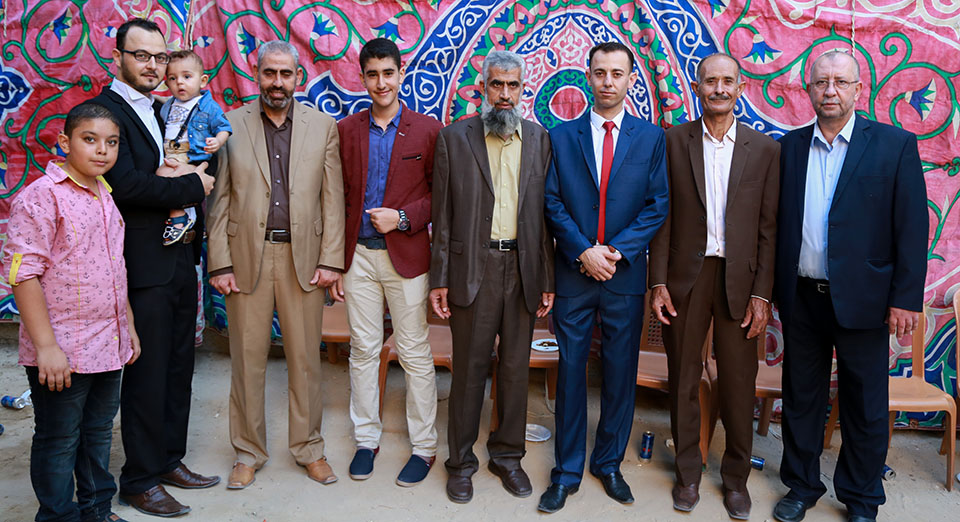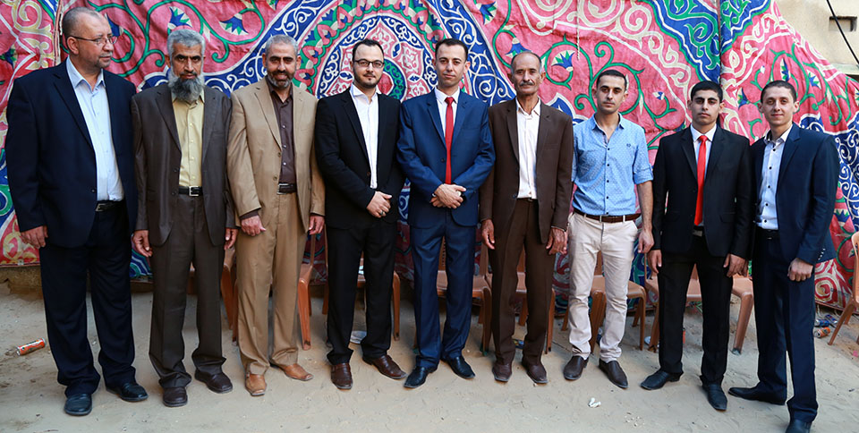 أ.ناجي قاسم الأغا(زوج خالة العروس) ونجليه عبد الله ومحمد، والد العروس، د.علاء فايز الخزندار وشقيقه أ.عامر(خالا العروس)