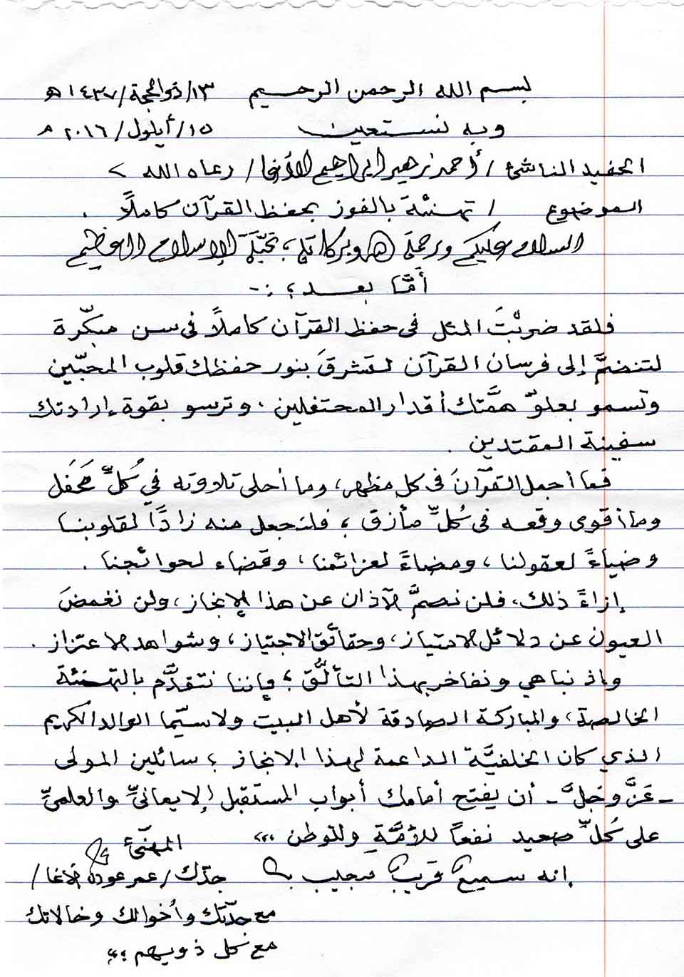تمكن الشبل أحمد زهير إبراهيم الأغا بحمد الله وفضله حفظ القران كاملاً، نفع الله به الإسلام والمسلمين، وألف مبارك