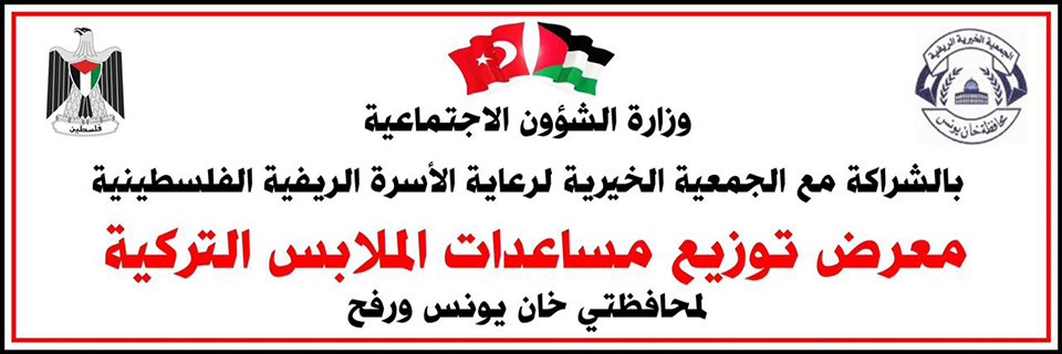 افتتحت وزارة الشؤون الاجتماعية بالشراكة مع الجمعية الخيرية لرعاية الأسرة الريفية الفلسطينيىة بخان يونس صباح اليوم الاربعاء الموافق 19-10-2016 معرضا خيريا اطلق عليه معرض كسوتي ... فرحتي ضمن سلسلة المعارض التي افتتحتها الوزارة لتوزيع المساعدات القادمة على متن السفن التركية القادمة لغزة، وذلك في محافظة خان يونس جنوب القطاع بحضور عدد من الشخصيات الاعتبارية في المنطقة وحشد كبير من المنتفعين والحالات الانسانية .