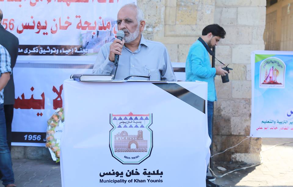 ومن جانبه ثمن الأستاذ محمد صادق رئيس المجلس العام لعائلات محافظة خان يونس صمود شعبنا الفلسطيني في وجه المحتل الغاصب، مؤكداً أن عائلات خان يونس قدمت أنموذجاً من التضحية والفداء والصبر ، مشيراً إلى أن ذكرى المذبحة الإسرائيلية بحق أبناء شعبنا العزل لا يمكن أن تنسى أو تغتفر ، وأن الأجيال القادمة لا تزال تحيي ذكراها لتكون نبراساً وتأكيداً على أهمية كشف بشاعة الاحتلال وجرائمه بحق المدنيين العزل الذين قتلوا بدم بارد.