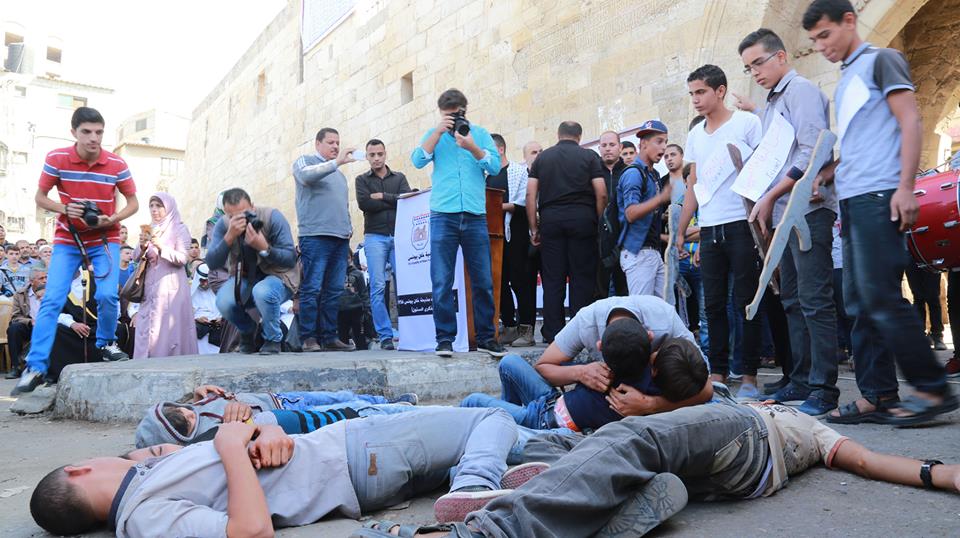 وتخلل الوقفة النشيد الوطني الفلسطيني، ومشهد تمثيلي صامت يجسد أحداث المجزرة، إلى جانب القاء الشعر والأغنية الوطنية، فيما قامت سيارات الاسعاف بإطلاق أصوات مكبراتها استنكاراً على أحداث المجزرة.
