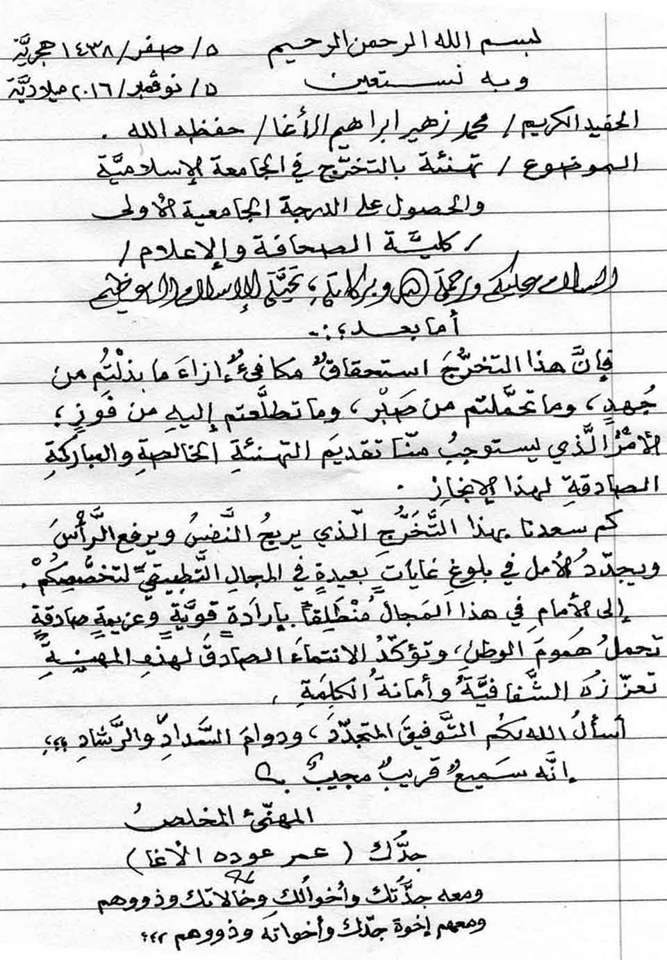 الرئيسة/نشاط/تهنئة بالتخرج للطالب محمد زهير الأغا نشاط تهنئة بالتخرج للطالب محمد زهير الأغا تاريخ النشر : السبت | 05-11-2016 | 13:21 5273 تهنئة مقدمة من الجد أ. عمر عودة الأغا اضغط هنا للتواصل أو التعرف على الأستاذ محمد زهير إبراهيم حمدان الأغا يمكنك تلقي أحدث الأخبار أول بأول بانضمامك لإحدى مجموعات الواتساب الخاصة بالعائلة من خلال الضغط هنـا اظهر المزيد