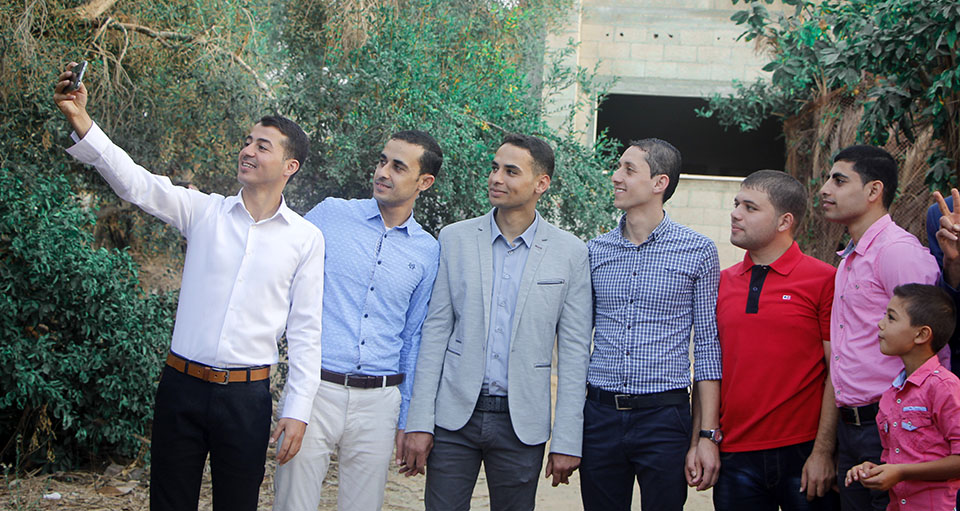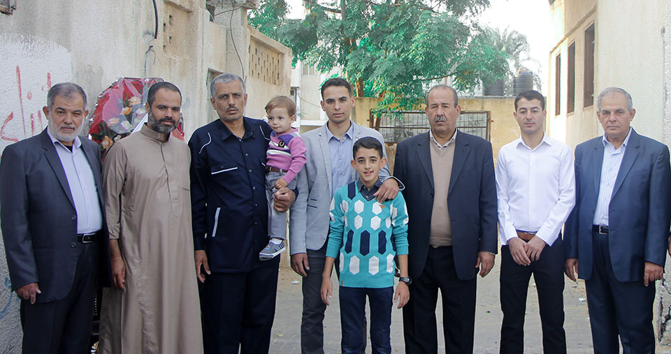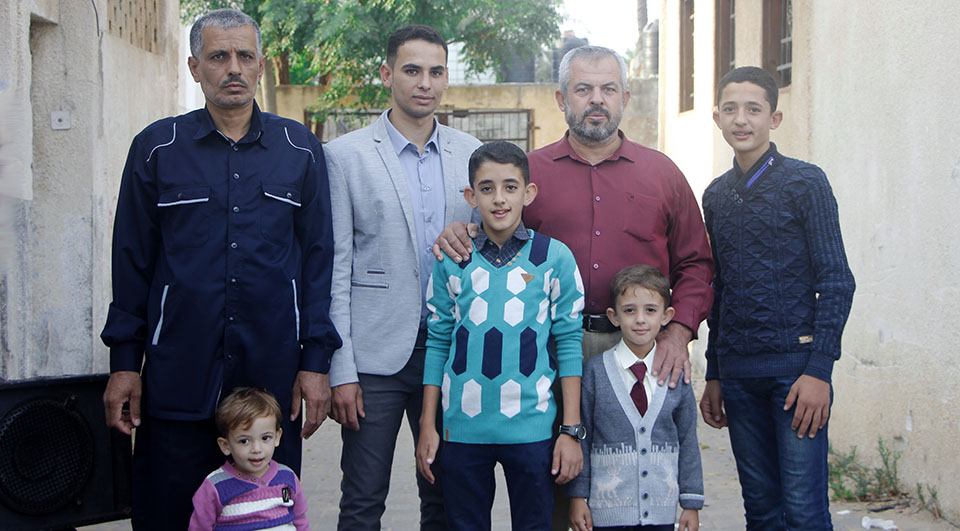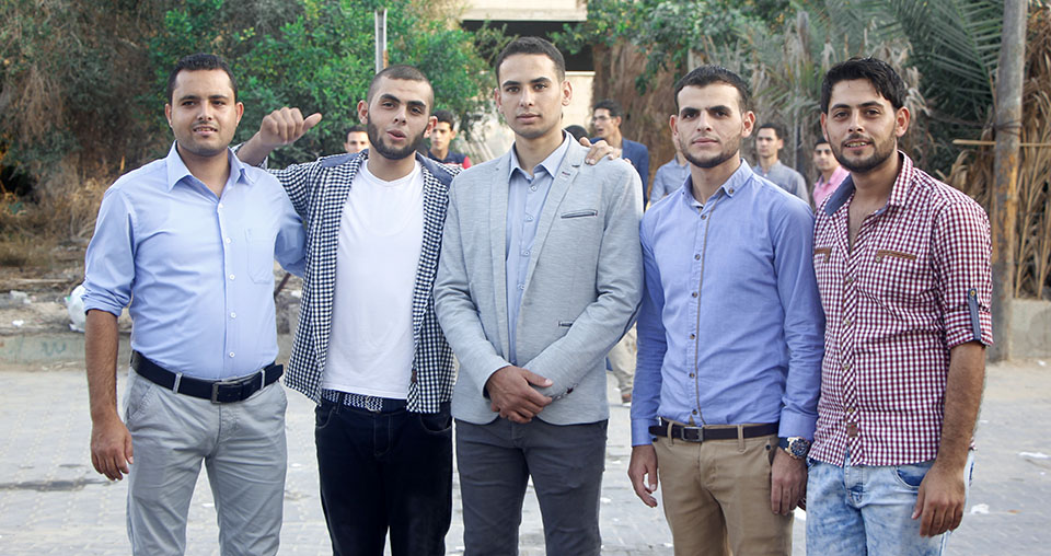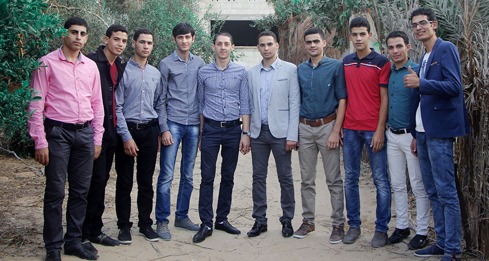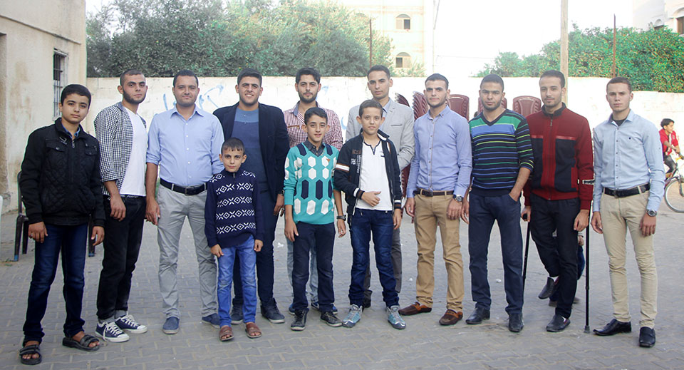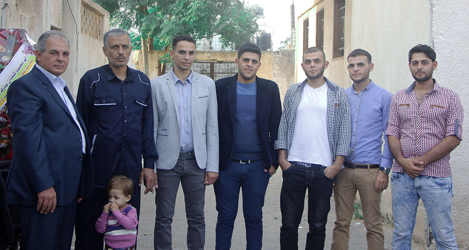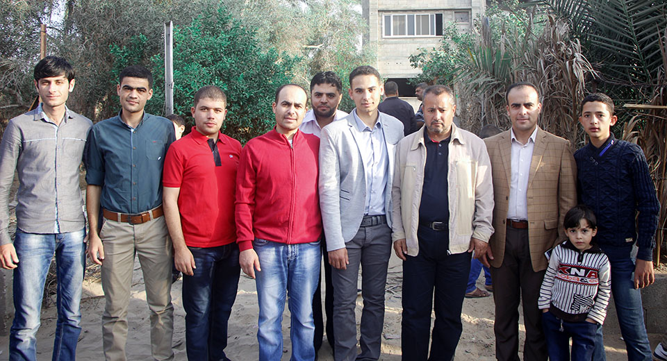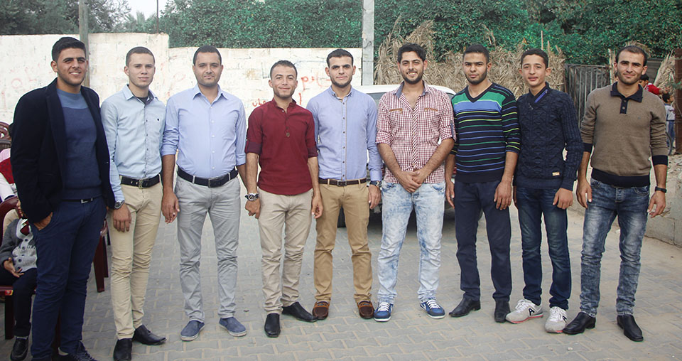 أحمد بشير وشقيقيه محمد ونبيل(ابناء عم العريس) ووالدهم أ. بشير، أ. وسام يونس الأغا(ابن خال العروس)، العريس، والد العريس، أ. أحمد يونس الأغا(ابن خال العروس)، أ. عدنان(عم العريس)