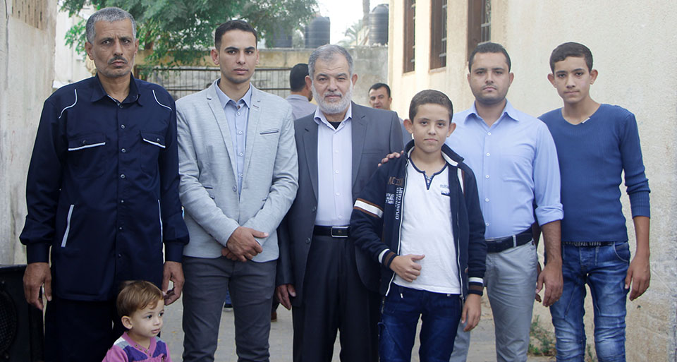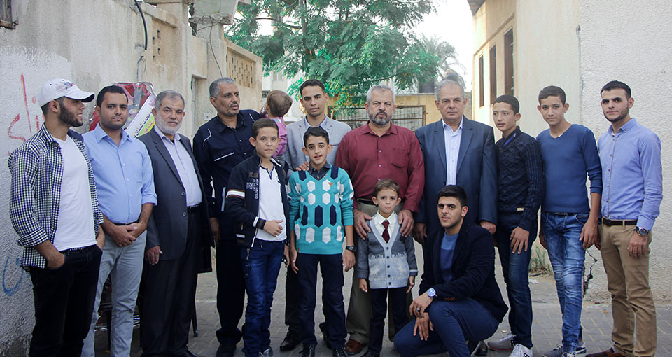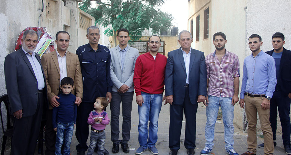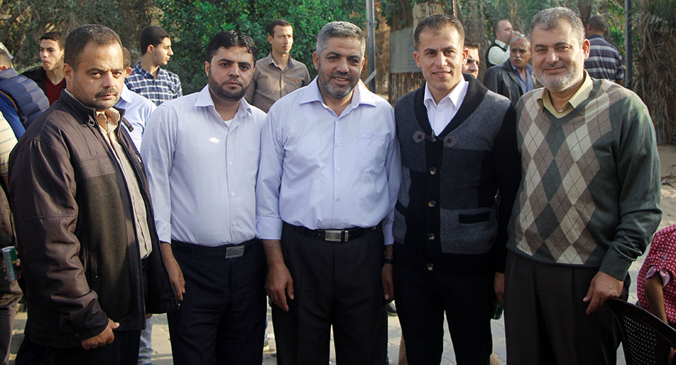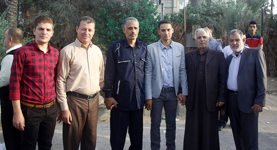 أ. عدنان(عم العريس)، أ. أبو خالد الزق(مدير كلية الأداب بجامعة الأزهر)، العريس، والد العريس، أ. جواد سعيد ونجله محمد