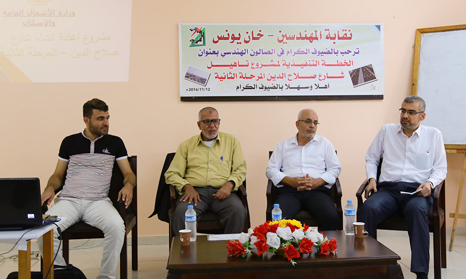 نظمت نقابة المهندسين فرع خان يونس يوم السبت الموافق 12/11/2016 صالون هندسي بعنوان الخطة التنفيذية لمشروع تأهيل شارع صلاح الدين المرحلة الثانية بحضور عدد لفيف من المهندسين وممثلي البلديات وضيوف اللقاء المهندس أحمد بن سعيد مدير عام الطرق في وزارة الاشغال العامة والإسكان و المهندس وسليمان ابوريدة ممثل المكتب الاستشاري والمهندس اياد رشوان مدير المشروع من طرف وزارة الاشغال العامة و الاسكان ، وقد تطرق الضيوف الى تفاصيل المرحلة الثانية من المشروع وهيكلية التنفيذ ومهام الاطراف المختلفة بالإضافة الى استعراض تفصيلي لخطة العمل في المشروع خاصة الطرق البديلة وعوامل السلامة وفي نهاية اللقاء تم فتح المجال للنقاش والمداخلات.