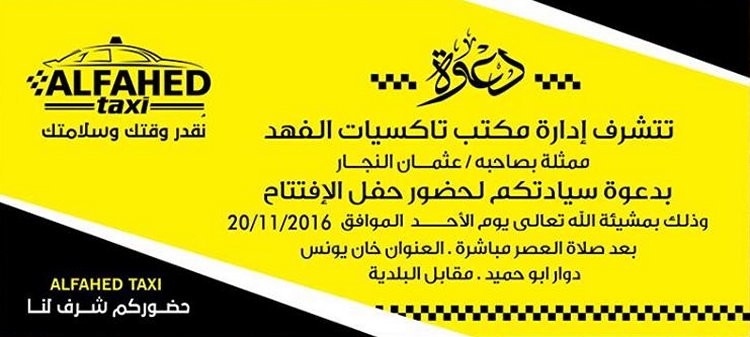 الرئيسة/متفرقات/دعوة لحضور إفتتاح مكتب تاكسيات الفهد متفرقات دعوة لحضور إفتتاح مكتب تاكسيات الفهد تاريخ النشر : الأربعاء | 16-11-2016 | 13:04 6288 دعوة لحضور إفتتاح مكتب تاكسيات الفهد لصاحبه: عثمان رأفت النجار يمكنك تلقي أحدث الأخبار أول بأول بانضمامك لإحدى مجموعات الواتساب الخاصة بالعائلة من خلال الضغط هنـا اظهر المزيد