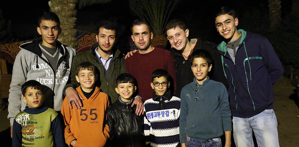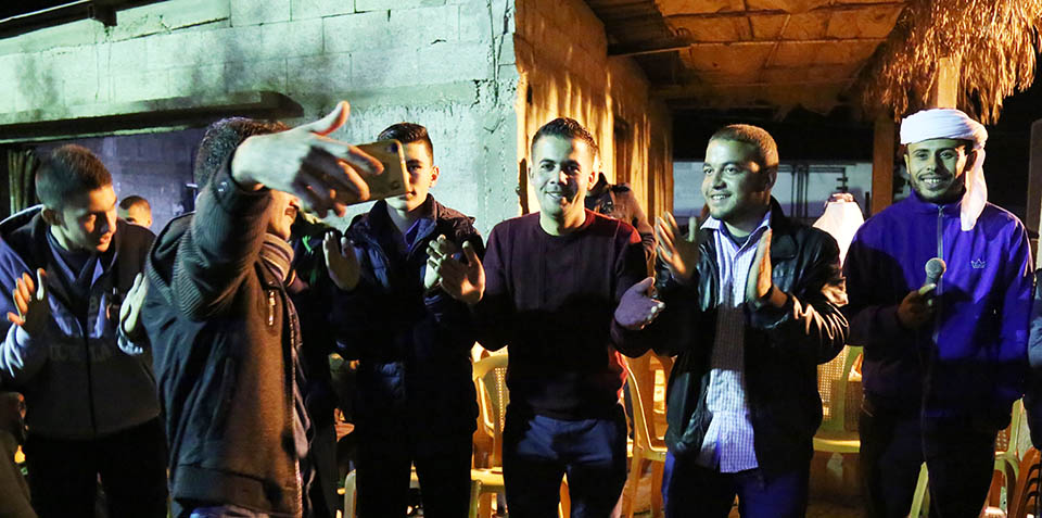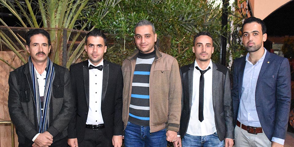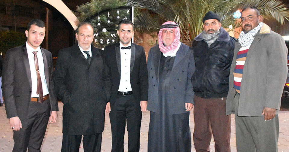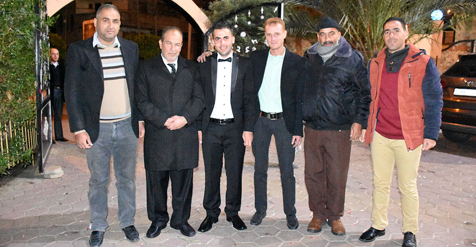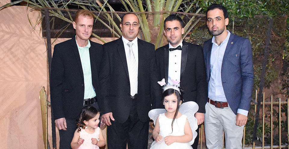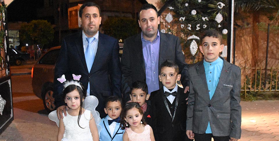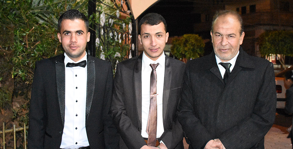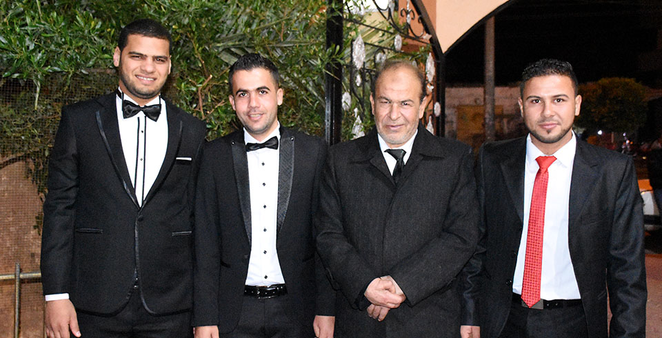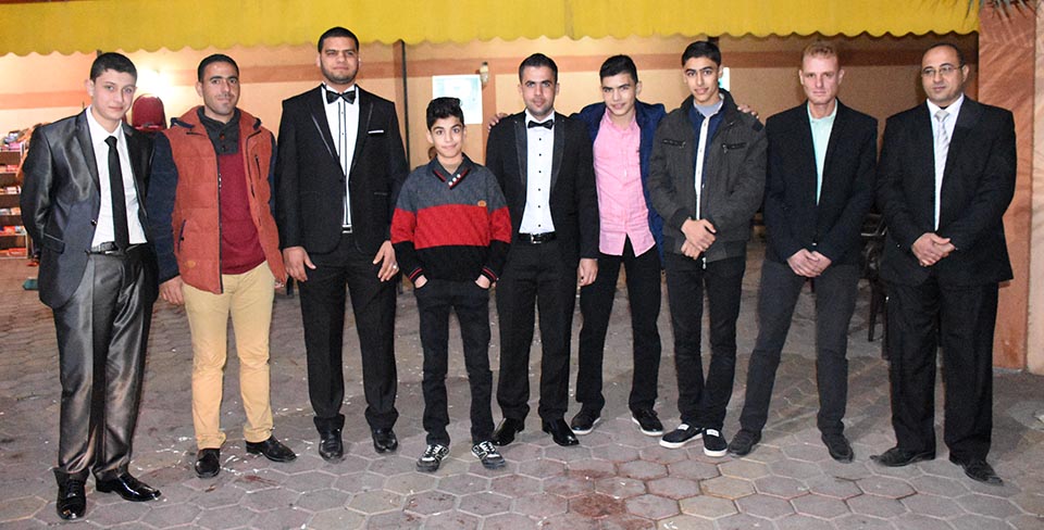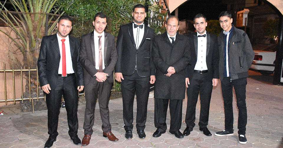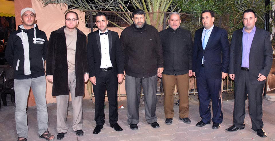م. محمد، أ. جعفر(شقيقا العريس)، أ. بديع عودة، م. بهاء يونس الأغا(زوج شقيقة العريس)، العريس، أ. محمد أنيس، أ. حمدان الهندي، والد العريس، العريس، والد العروس، عبدالشكور(شقيق العروس)