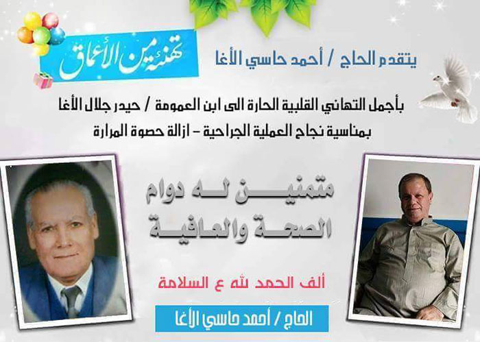 القاهرة-03-12-2016- تناول طعام الغذاء في منزل الأستاذ أحمد حاسي الأغا، وذلك بمناسبة تماثل وشفاء السيد حيدر جلال الأغا، بعد نجاح العملية الجراحية، وبحضور عدد من الأصدقاء وأبناء العائلة، وألف حمداً لله على السلامة.