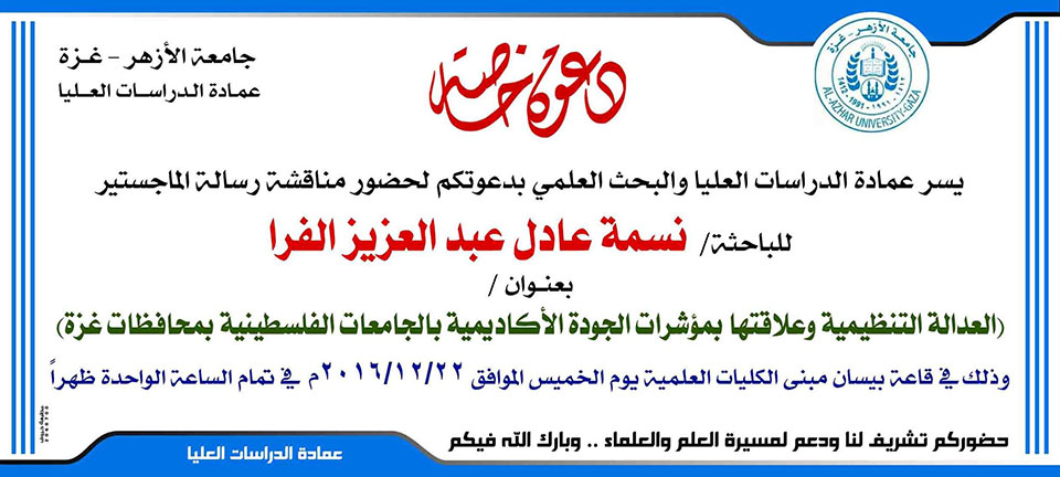 الرئيسة/متفرقات/دعوة لحضور مناقشة رسالة ماجستير للباحثة نسمة عادل الفرا متفرقات دعوة لحضور مناقشة رسالة ماجستير للباحثة نسمة عادل الفرا تاريخ النشر : الإثنين | 19-12-2016 | 16:20 5987 اضغط هنا للتواصل أو التعرف على الأستاذة نسمة عادل عبد العزيز حماد عودة احمد محمد عبدالله مبروك عبدالله احمد حسن عبدالله الفرا يمكنك تلقي أحدث الأخبار أول بأول بانضمامك لإحدى مجموعات الواتساب الخاصة بالعائلة من خلال الضغط هنـا اظهر المزيد