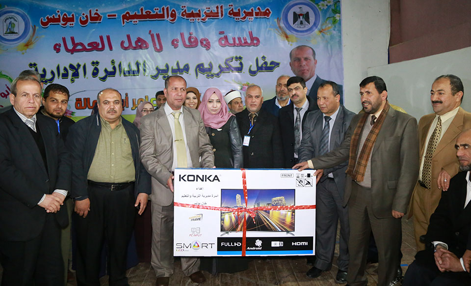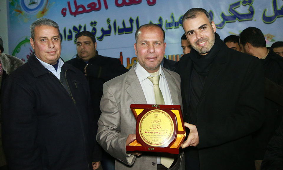 في حفل تربوي كبير وأجواء أسرية كرمت مديرية التربية والتعليم بخان يونس صباح اليوم الخميس الموافق 16/2/2017، في قاعة الهلال الأحمر الفلسطيني بخان يونس، أ. حسين أبو شمالة مدير الدائرة الإدارية بالمديرية، بحضور: د. زياد ثابت وكيل وزارة التربية والتعليم العالي، ونائبي المجلس التشريعي أ. يحيى موسى ود. صلاح البردويل ود. أيمن اليازوري وكيل الوزارة المساعد لشئون التعليم العالي، وفضيلة مفتي خان يونس الشيخ إحسان عاشور، ود. محمد أبو شقير وكيل وزارة التربية والتعليم السابق، ود. عبد القادر أبو علي مدير التربية والتعليم بخان يونس، ولفيف من المدراء العامين بالوزارة، وأ. د. إبراهيم الأسطل رئيس الجامعة الإسلامية فرع الجنوب، وأ. نضال أبو حجير عميد الكلية الجامعية للعلوم والتكنولوجيا، ومديري التربية والتعليم بمحافظات غزة، وأ. حسين أبو شمالة مدير الدائرة الإدارية المحتفى به، وأ. خالد ماضي مدير الدائرة الفنية بالمديرية، ومديري الدوائر بالوزارة ومديري الدوائر الإدارية والفنية بمديريات غزة، ومديرا التربية والتعليم بخان يونس الأسبقين أ. عبد المجيد الزطمة، وأ. فاطمة الجعيثني، وأساتذة الجامعات، ووفد من نقابة المعلمين ترأسه أ. خالد المزين نقيب المعلمين في محافظات غزة، وممثلين مجالس العائلات وملتقى عائلات خان يونس، وحشد من الرياضيين ومشجعي الأندية الرياضية، ووفد من الحركة النسائية والوجهاء وشخصيات المجتمع المحلي المدني والأمني، ورؤساء الأقسام والمشرفين التربويين ومديري ومديرات المدارس والمعلمين والمعلمات والعديد من شخصيات وأُسر عائلة أبو شمالة.