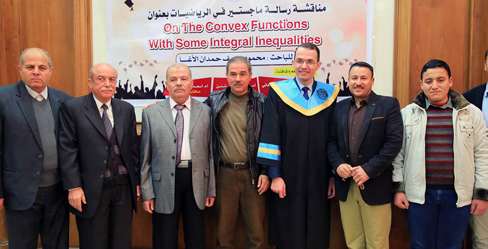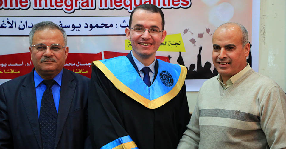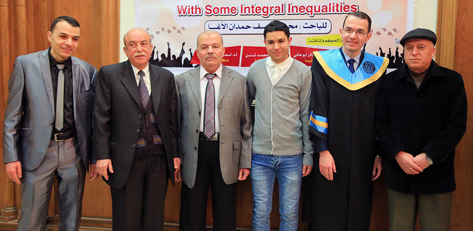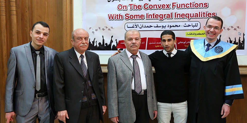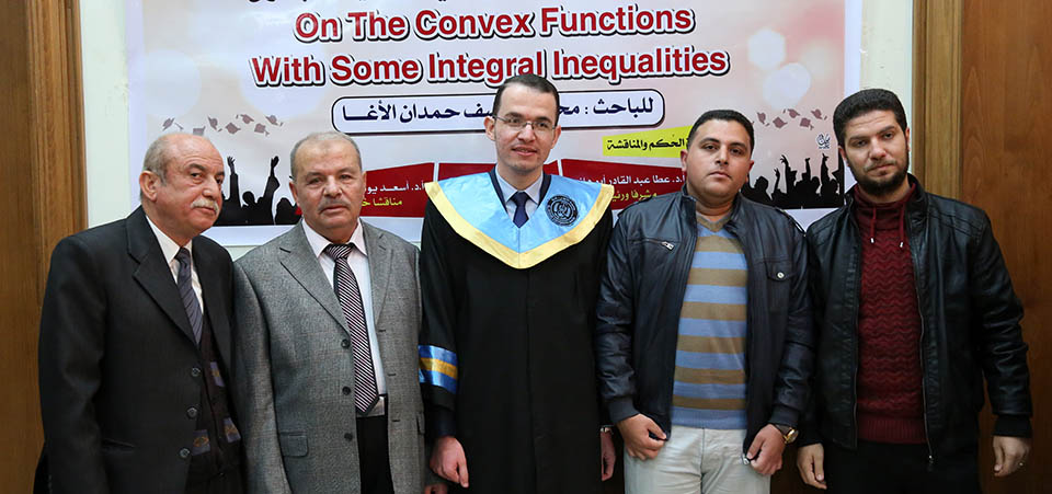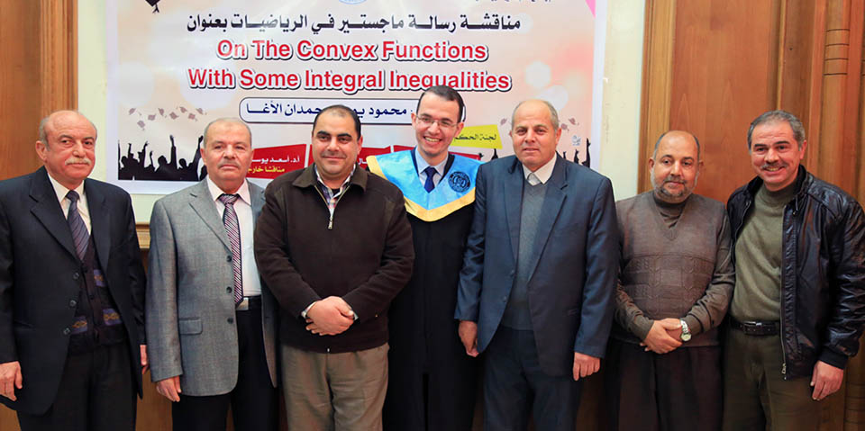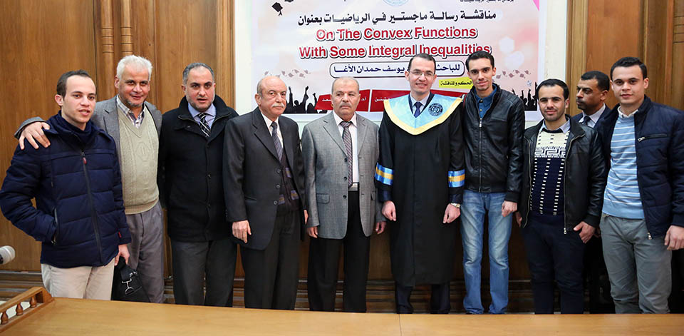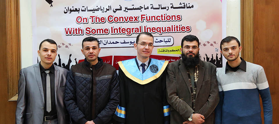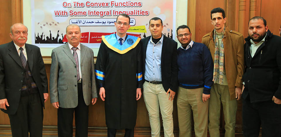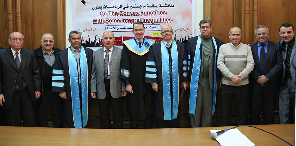 حول الدوال المُحدبة وبعض المتباينات التكاملية، وقد تكونت لجنة المناقشة من أ. د. عطا عبدالقادر أبوهاني، مشرفاً ورئيساً، أ. د. جمال محمد شنن، مناقشاً داخلياً، أ. د. أسعد يوسف أسعد، مناقشاً خارجياً.