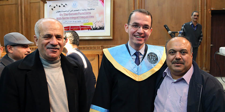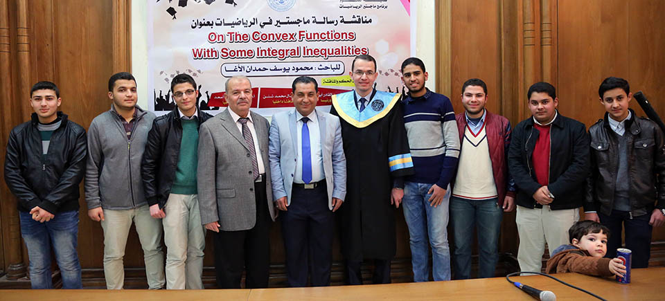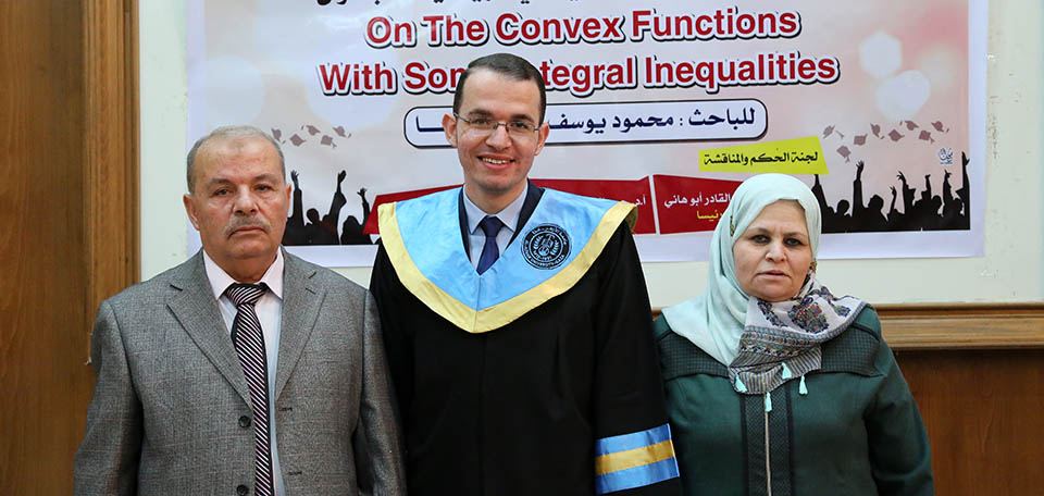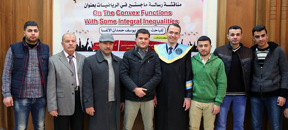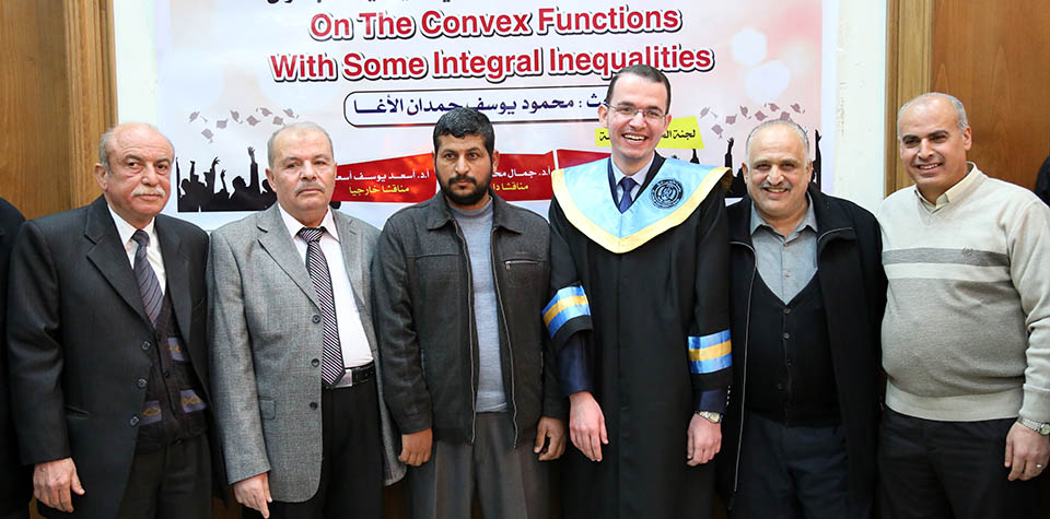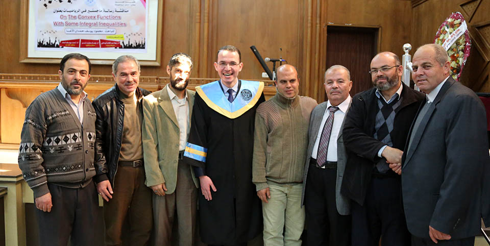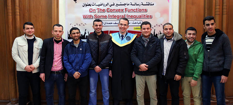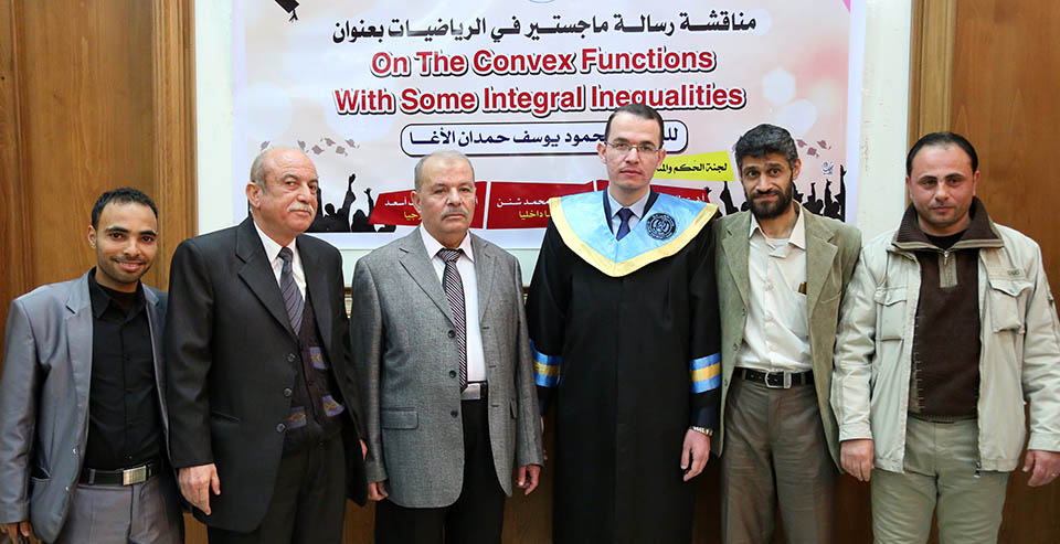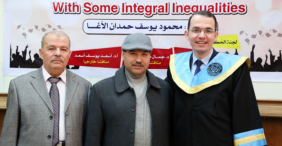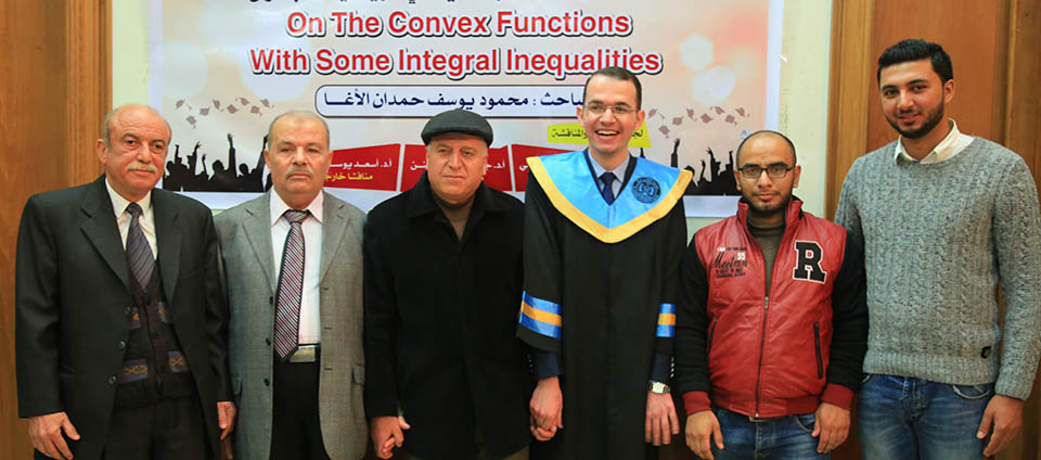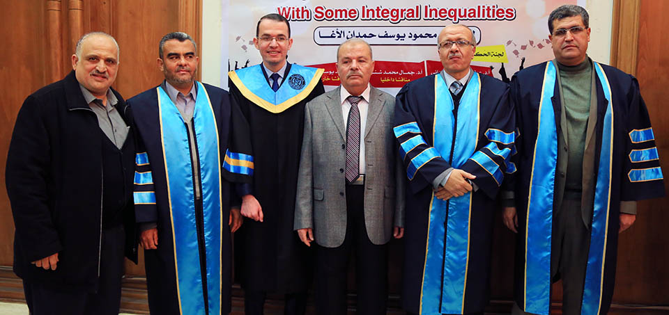 حول الدوال المُحدبة وبعض المتباينات التكاملية، وقد تكونت لجنة المناقشة من أ. د. عطا عبدالقادر أبوهاني، مشرفاً ورئيساً، أ. د. جمال محمد شنن، مناقشاً داخلياً، أ. د. أسعد يوسف أسعد، مناقشاً خارجياً.