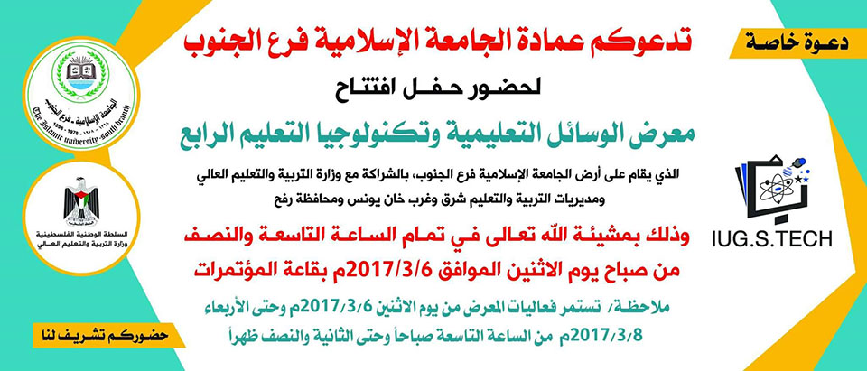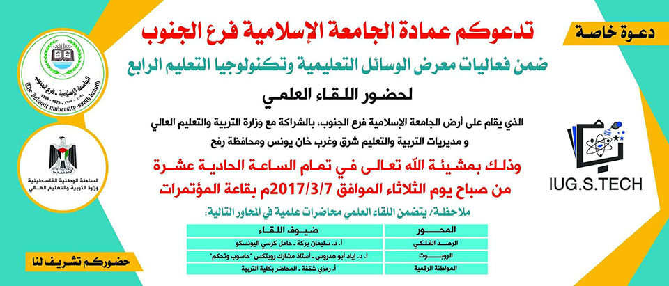 الرئيسة/متفرقات/الجامعة الإسلامية (فرع الجنوب)- دعوة لحضور المعرض واللقاء العلمي متفرقات الجامعة الإسلامية (فرع الجنوب)- دعوة لحضور المعرض واللقاء العلمي تاريخ النشر : الأحد | 26-02-2017 | 07:05 3986 يمكنك تلقي أحدث الأخبار أول بأول بانضمامك لإحدى مجموعات الواتساب الخاصة بالعائلة من خلال الضغط هنـا اظهر المزيد