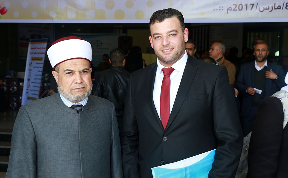أ. عماد أحمد البطة ( رئيس العلاقات العامة والتسويق بنك الإنتاج الفلسطيني راعي مالي لهذا المعرض)، مفتي محافظة خان يونس فضيلة الشيخ إحسان عاشور
