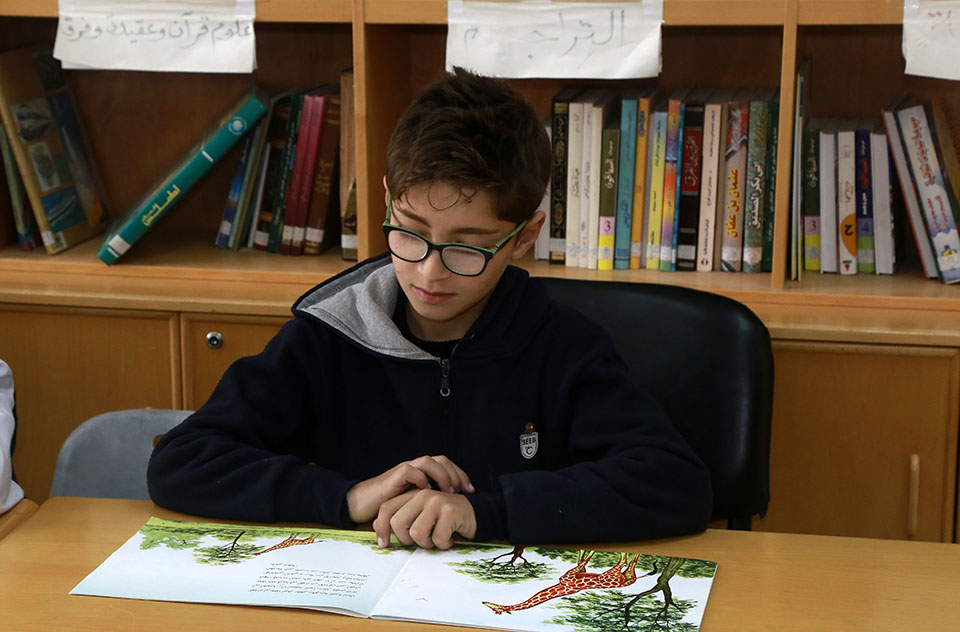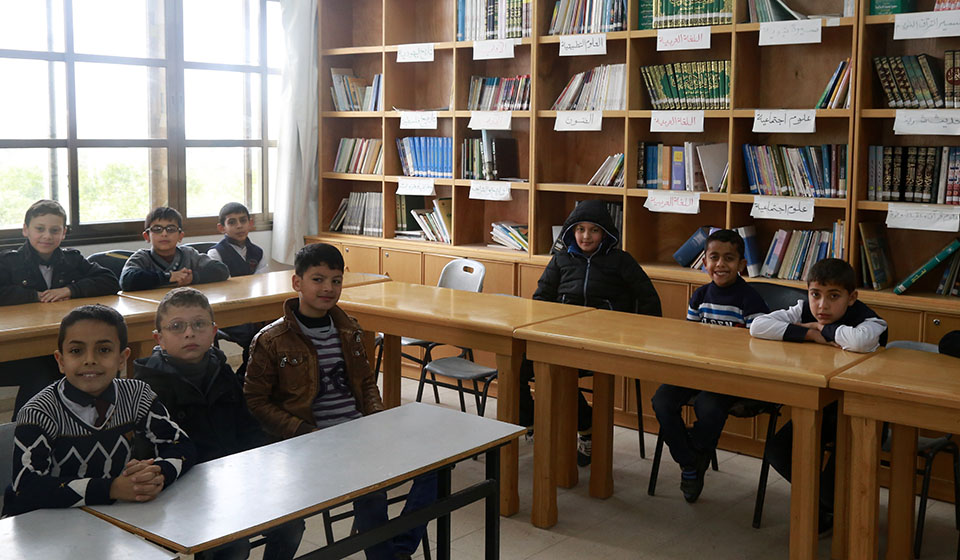 - مكتبة مدرسية تحتوي على شاشة عرض للترفيه