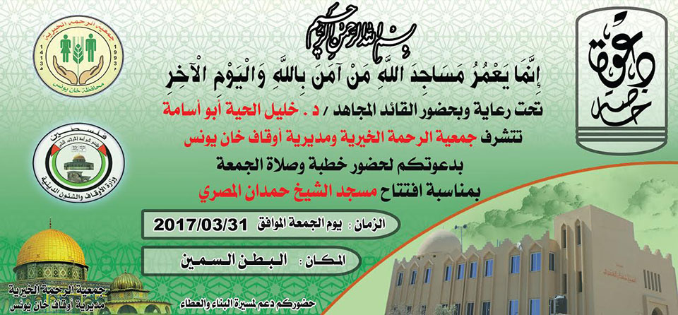 الرئيسة/مناسبات خارج العائلة/البطن السمين- دعوة لحضور افتتاح مسجد الشيخ حمدان المصري مناسبات خارج العائلة البطن السمين- دعوة لحضور افتتاح مسجد الشيخ حمدان المصري تاريخ النشر : الأربعاء | 29-03-2017 | 18:44 7340 بسم الله الرحمن الرحيمدعوة لحضور افتتاح مسجد الشيخ حمدان المصري - البطن السمين يمكنك تلقي أحدث الأخبار أول بأول بانضمامك لإحدى مجموعات الواتساب الخاصة بالعائلة من خلال الضغط هنـا اظهر المزيد