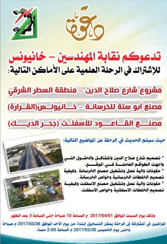 السبت 01.04.2017- خان يونس- نقابة المهندسين تقوم برحلة علمية، وشملت المناطق الأتية: