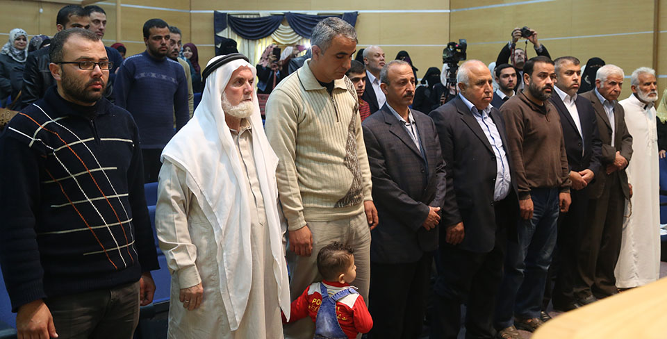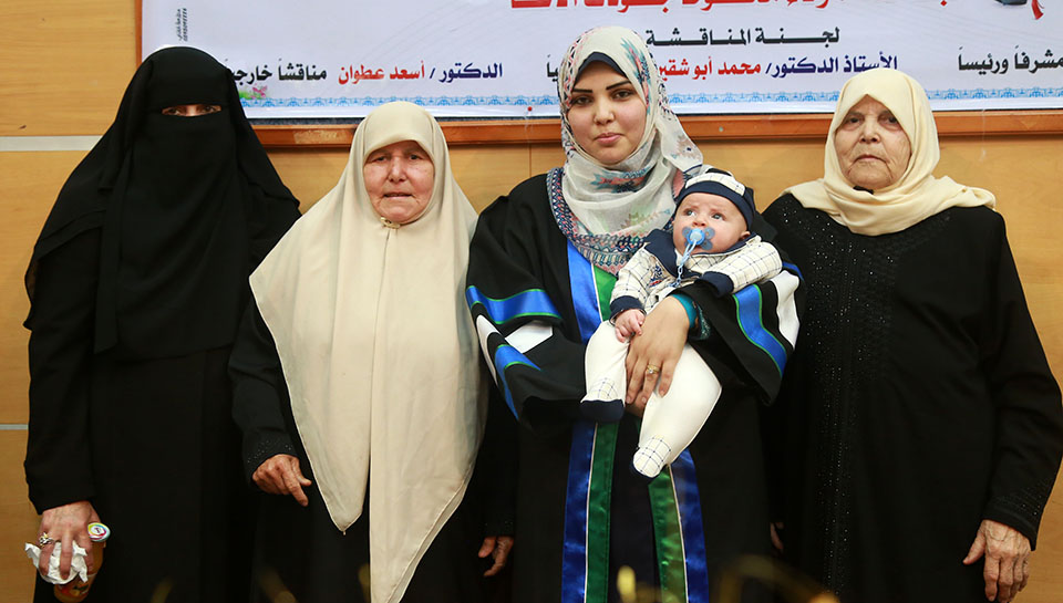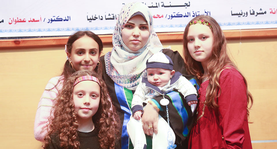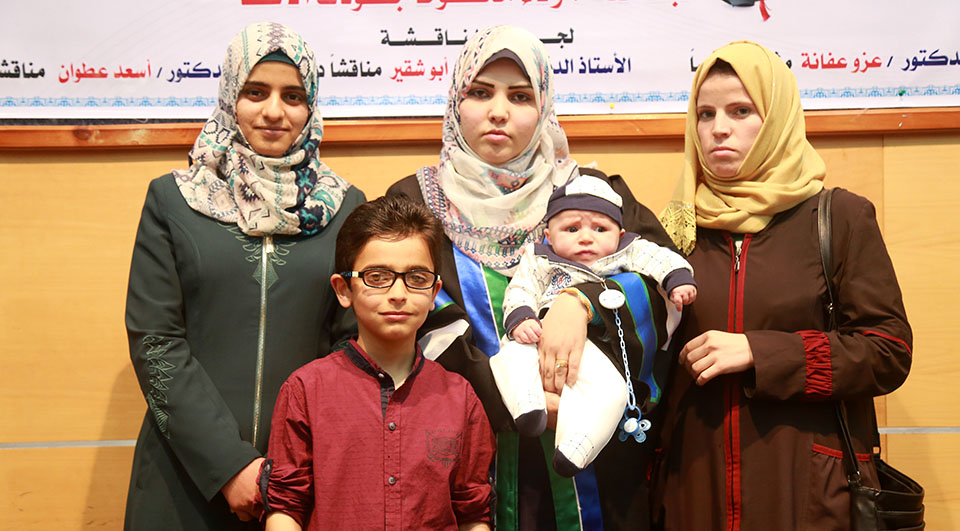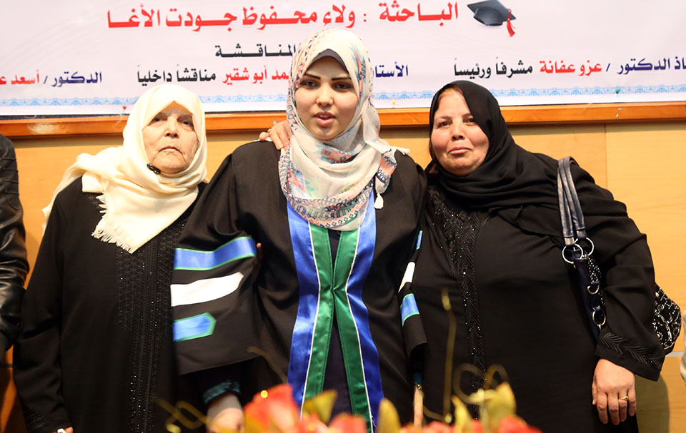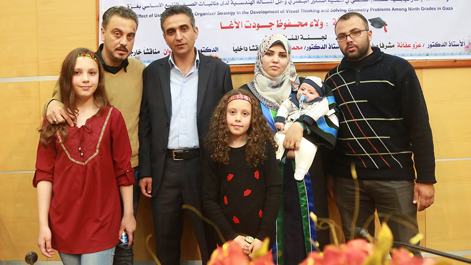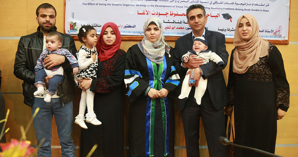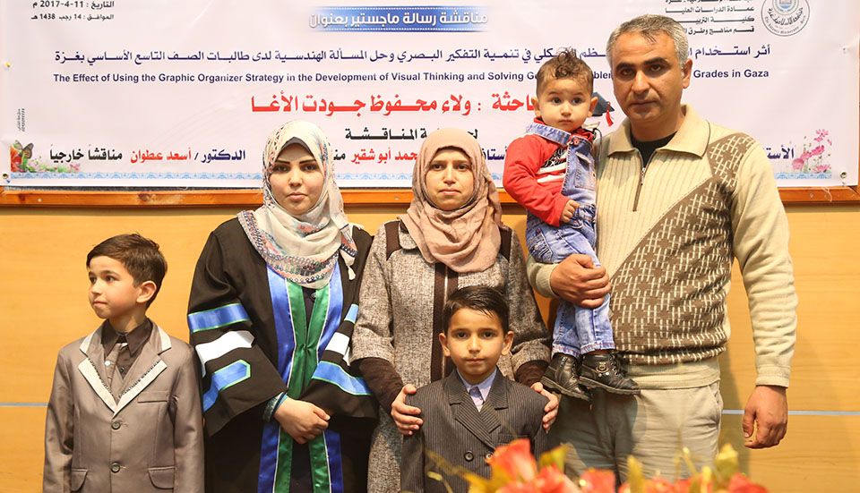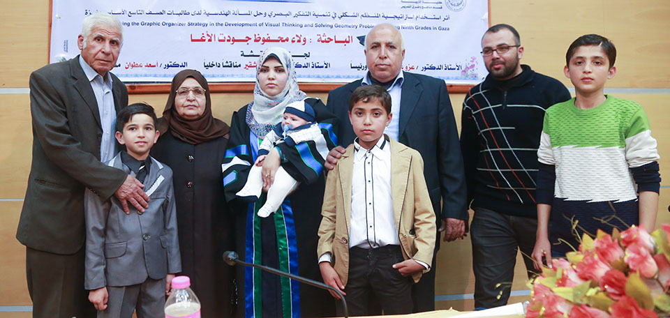 أ. محمد (شقيق الباحثة)، والد الباحثة، الشيخ مازن الأغا، أ. د. عزو إسماعيل عفانة ، د. أسعد عطوان، أ. ولاء محفوظ الأغا(الباحثة)، زوج الباحثة، أ. د. محمد أبو شقير،،