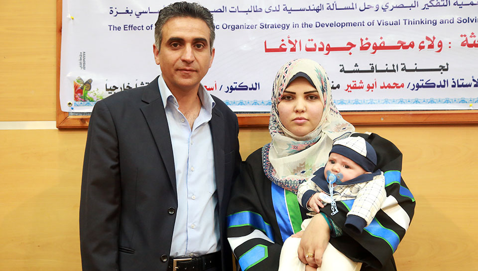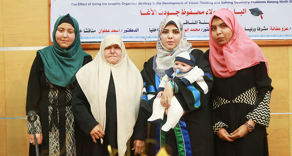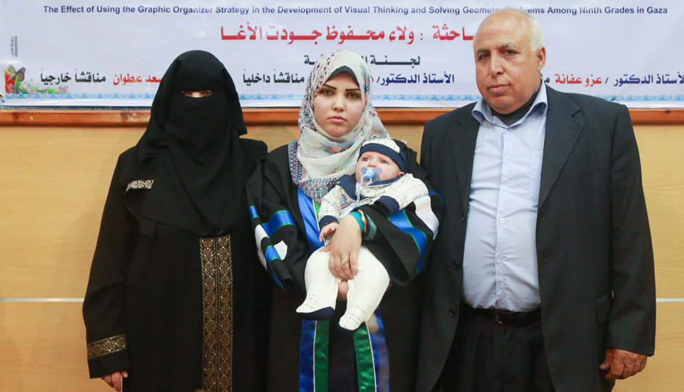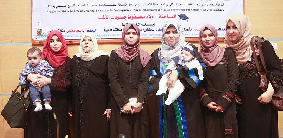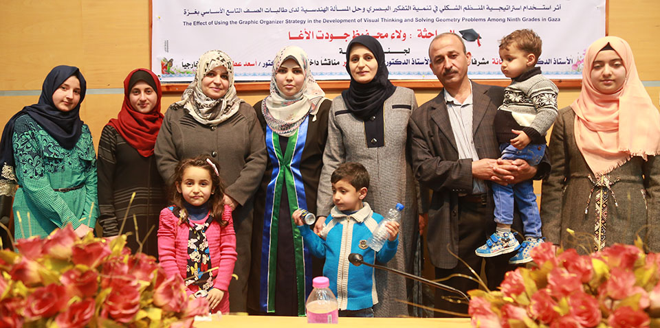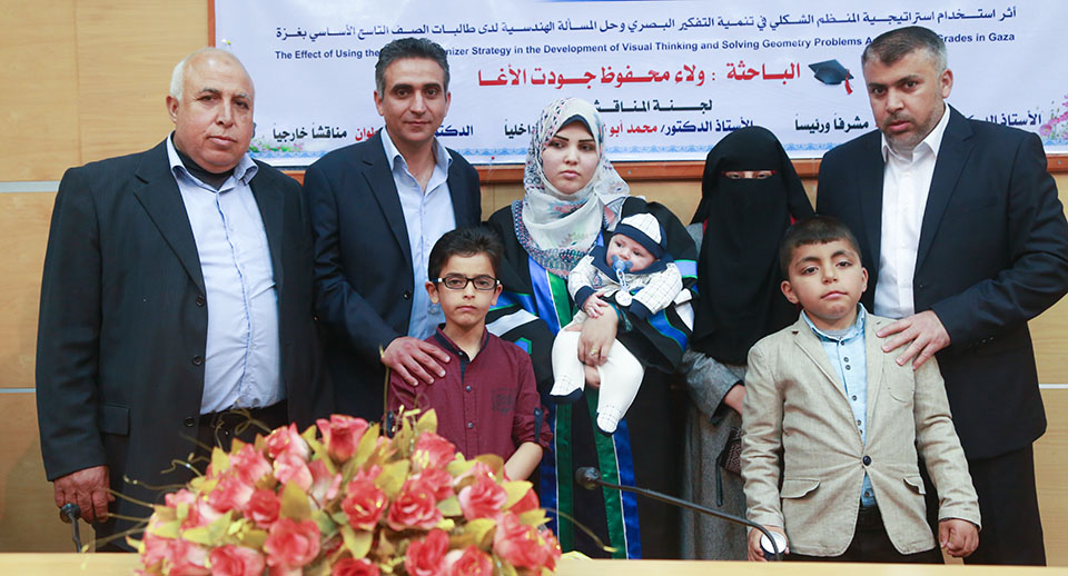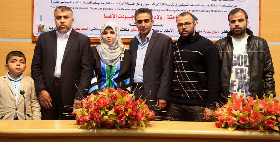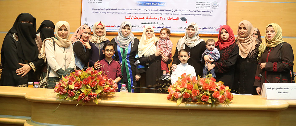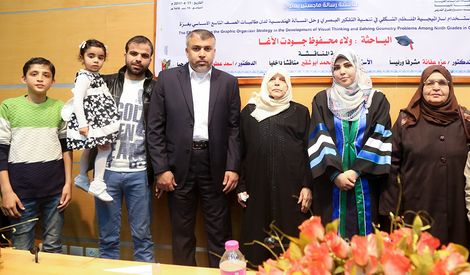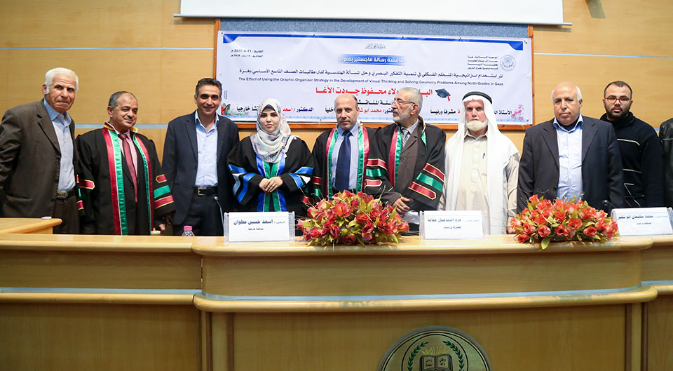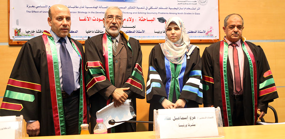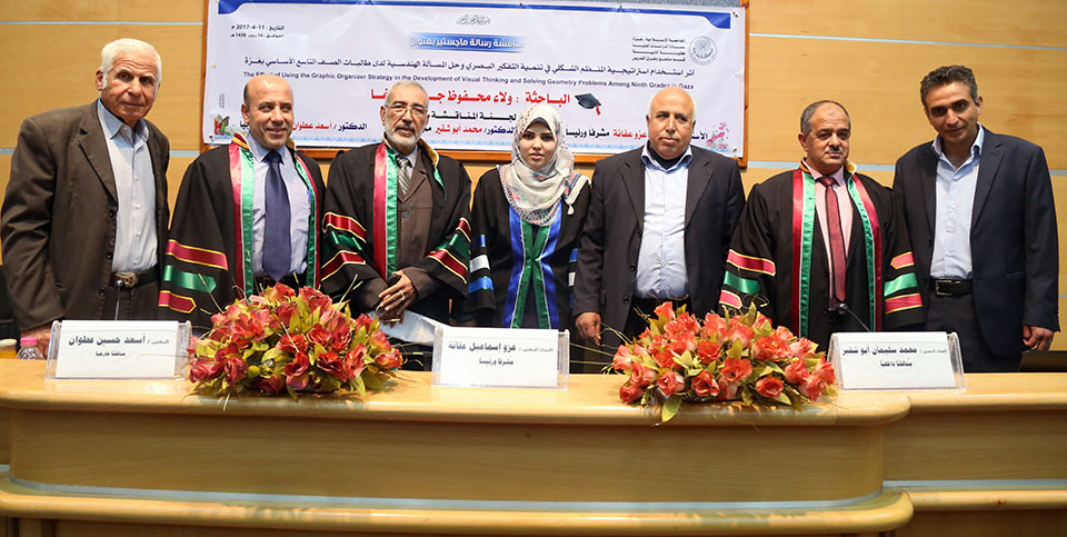 خان يونس- الجامعة الإسلامية- فرع الجنوب- كلية التربية- الثلاثاء 11-04-2017- مناقشة رسالة ماجستير أ. ولاء محفوظ جودت الأغا، وكانت الرسالة تحمل عنوان: اثر إستخدام إستراتيجية المنظم الشكلي في تنمية التفكير البصري، وحل المسألة الهندسية لدى طالبات الصف التاسع الأساسي بغزة.