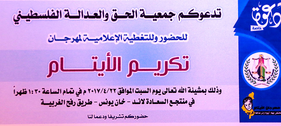 الرئيسة/متفرقات/دعوة لحضور مهرجان تكريم الأيتام متفرقات دعوة لحضور مهرجان تكريم الأيتام تاريخ النشر : الأربعاء | 19-04-2017 | 12:47 4632 بسم الله الرحمن الرحيملمزيد من الإستفسار أ. ياسر 0599302285 اضغط هنا للتواصل أو التعرف على أ. ياسر محمد عودة فالوجي الأغا يمكنك تلقي أحدث الأخبار أول بأول بانضمامك لإحدى مجموعات الواتساب الخاصة بالعائلة من خلال الضغط هنـا اظهر المزيد