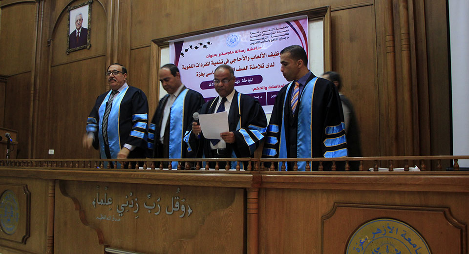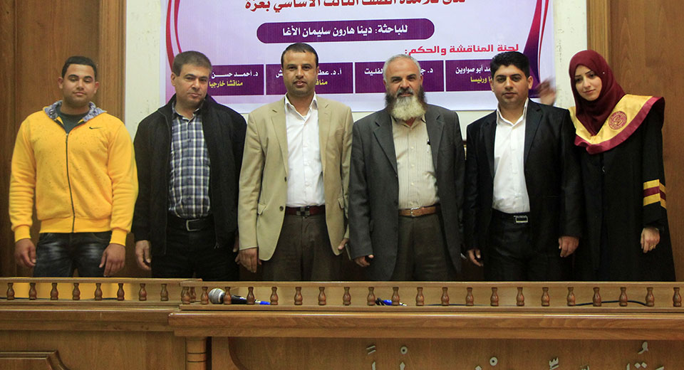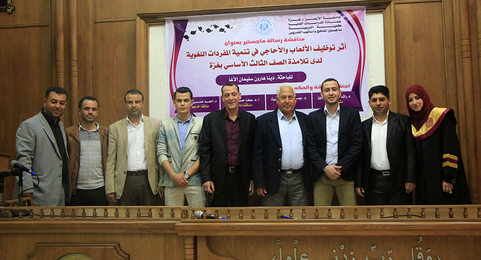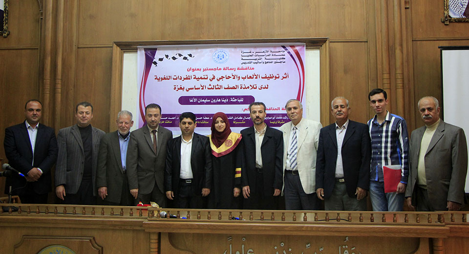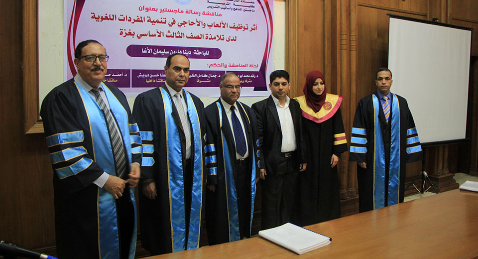 قاعة بيسان- جامعة الأزهر- غزة- الخميس الموافق 20-04-2017 ، الباحثة دينا هارون سليمان الأغا، زوجة أ. محمد كمالعثمان العبادلة، تنال درجة الماجستير في المناهج وطرق التدريس والتي كانت بعنوان أثر توظيف الألعاب والأحاجي في تنمية المفردات اللغوية لدى تلامذة الصف الثالث الاساسي بغزة وقد تكونت لجنة المناقشة من د. راشد محمد أبو صواوين، مشرفاً ورئيساً، د. جمال كامل الفليت، مشرفاً، أ. د. عطا حسن درويش، مناقشاً داخلياً، د. أحمد حسن اللوح، مناقشاً خارجياً.