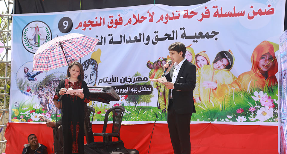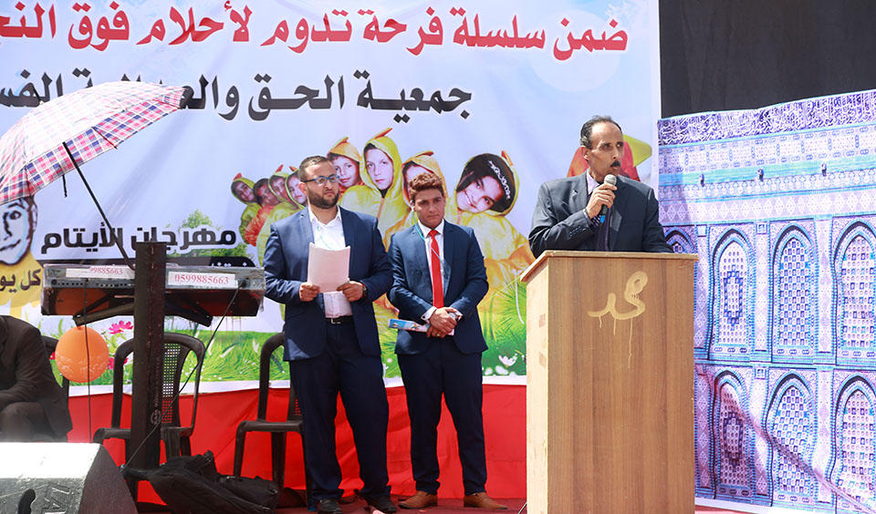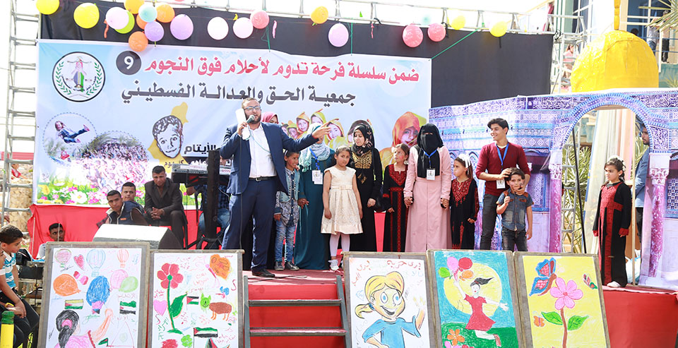 خان يونس- منتجع السعادة- السبت 22-04-2017- نظمت جمعية الحق والعدالة الفلسطيني مهرجان تكريم الأيتام للعام التاسع على التوالي، تحت شعار، فرحة تدوم لأحلام فوق النجوم، وبحضور شخصيات من المجتمع المحلي، وأهالي الأيتام، وممثلي عن المجلس العام لعائلات خان يونس.
