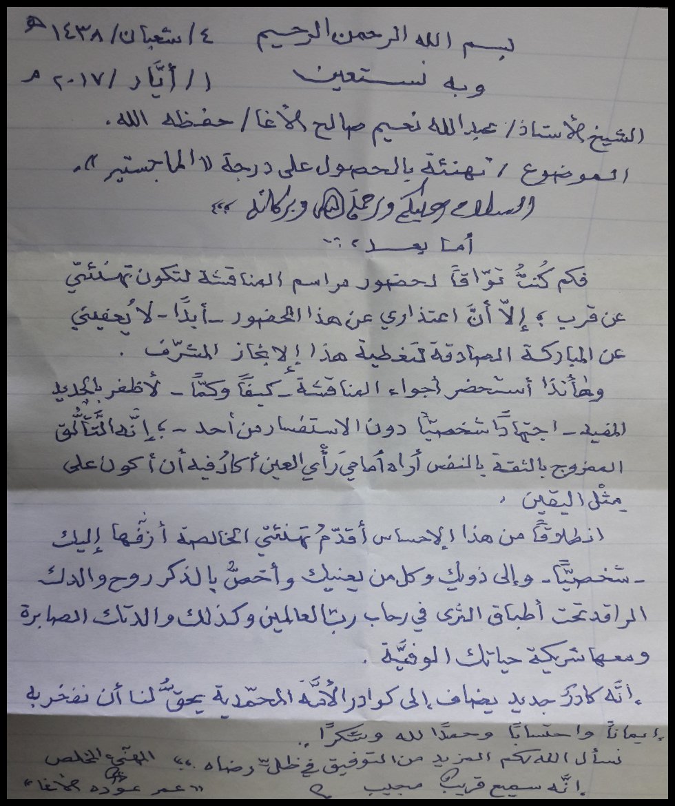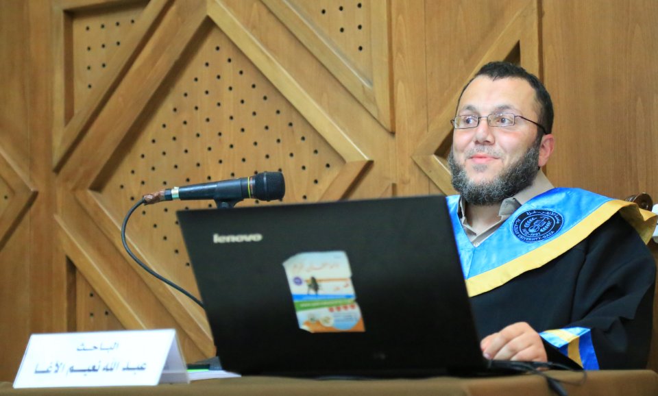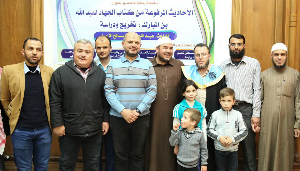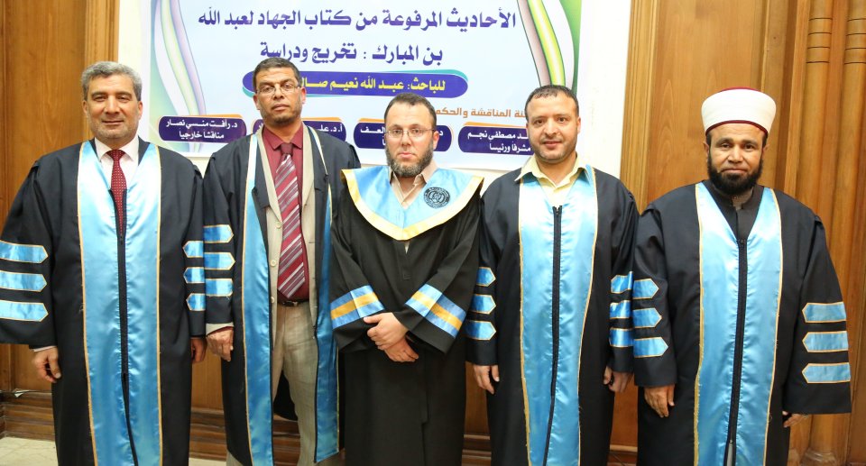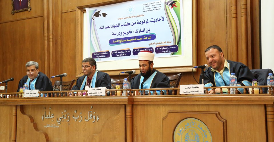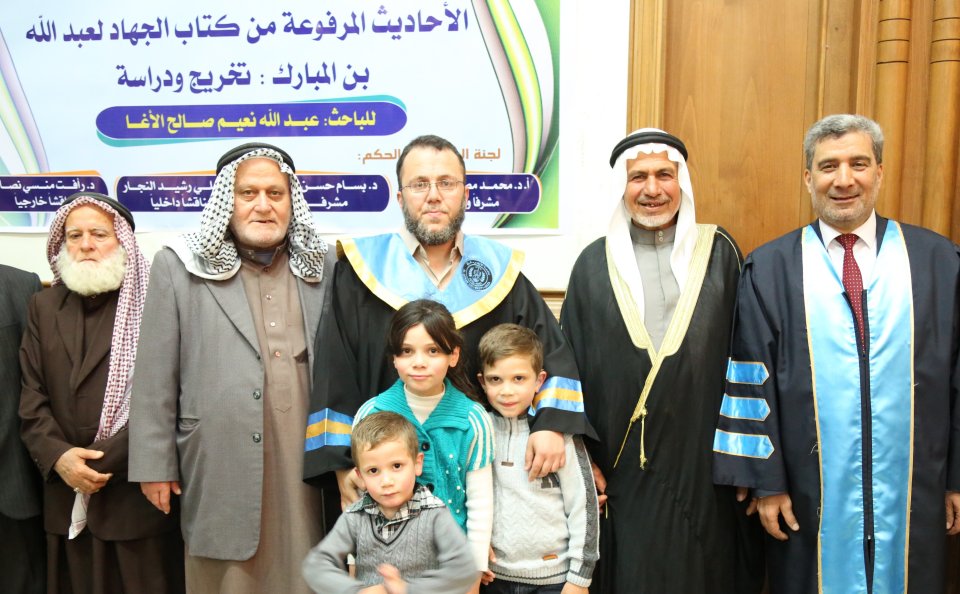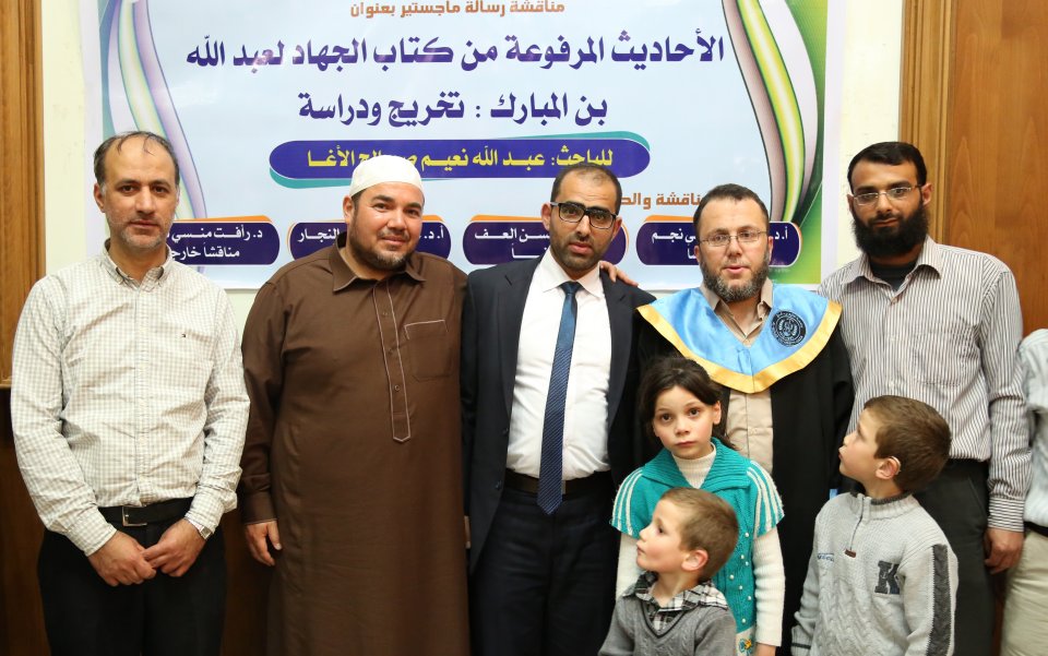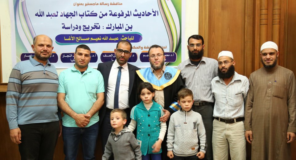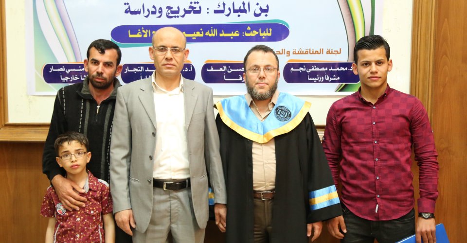 جامعة الأزهر غزة الثلاثاء 25-04-2017 حصول أ. عبدالله نعيم الأغا على درجة الماجستير في الحديث الشريف في جامعة الازهر بغزّة، والف مبارك وقد تكونت لجنة المناقشة من د. رأفت منسي نصار(المناقش الخارجي)، أ د. حمد مصطفى نجم(مشرفا ورئيسأ)، د. بسام العف(مشرفأ ثانيا)، أ د. علي رشيد النجار(مناقش داخلي)، والف مبارك.