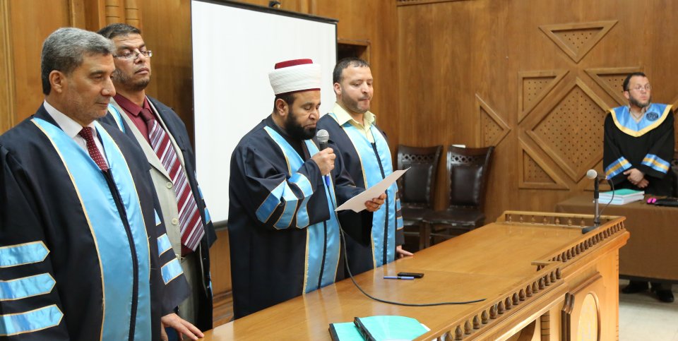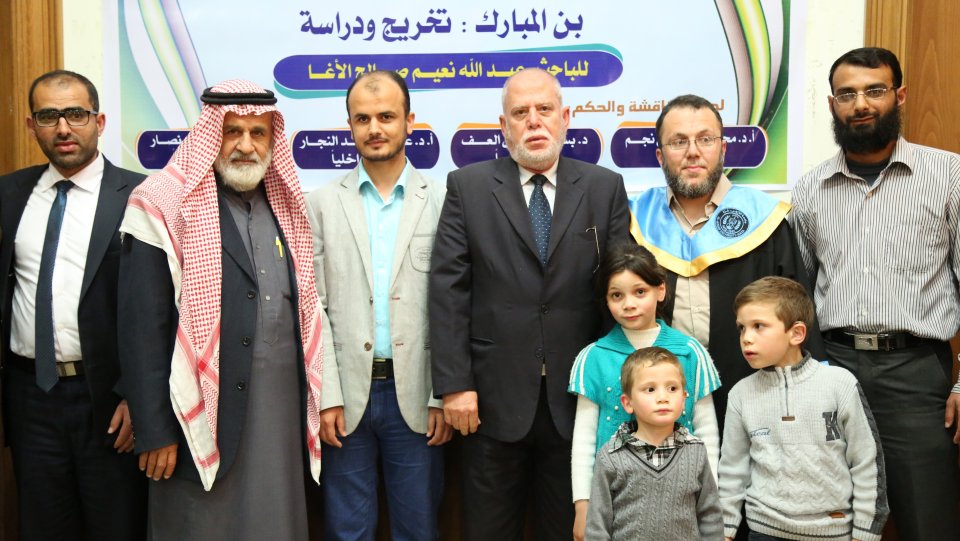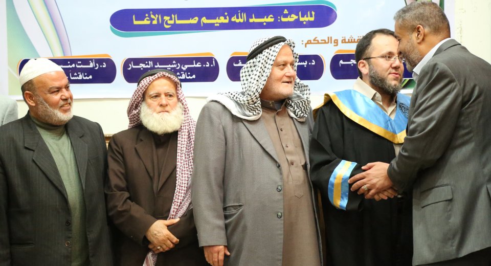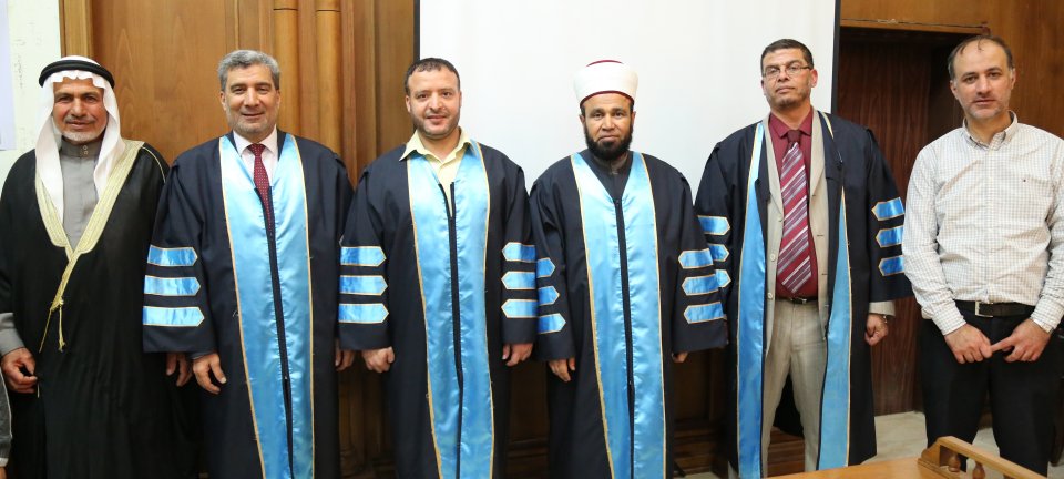 أ د. محمد مصطفى نجم(مشرفا ورئيسأ)، د. رأفت منسي نصار(المناقش الخارجي)، الباحث د. بسام العف(مشرفأ ثانيا)، أ د. علي رشيد النجار(مناقش داخلي)