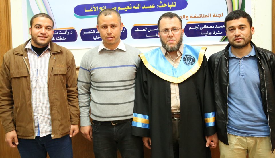د. رأفت منسي نصار(المناقش الخارجي)، أ د. محمد مصطفى نجم(مشرفا ورئيسأ)، د. بسام العف(مشرفأ ثانيا)، أ د. علي رشيد النجار(مناقش داخلي)